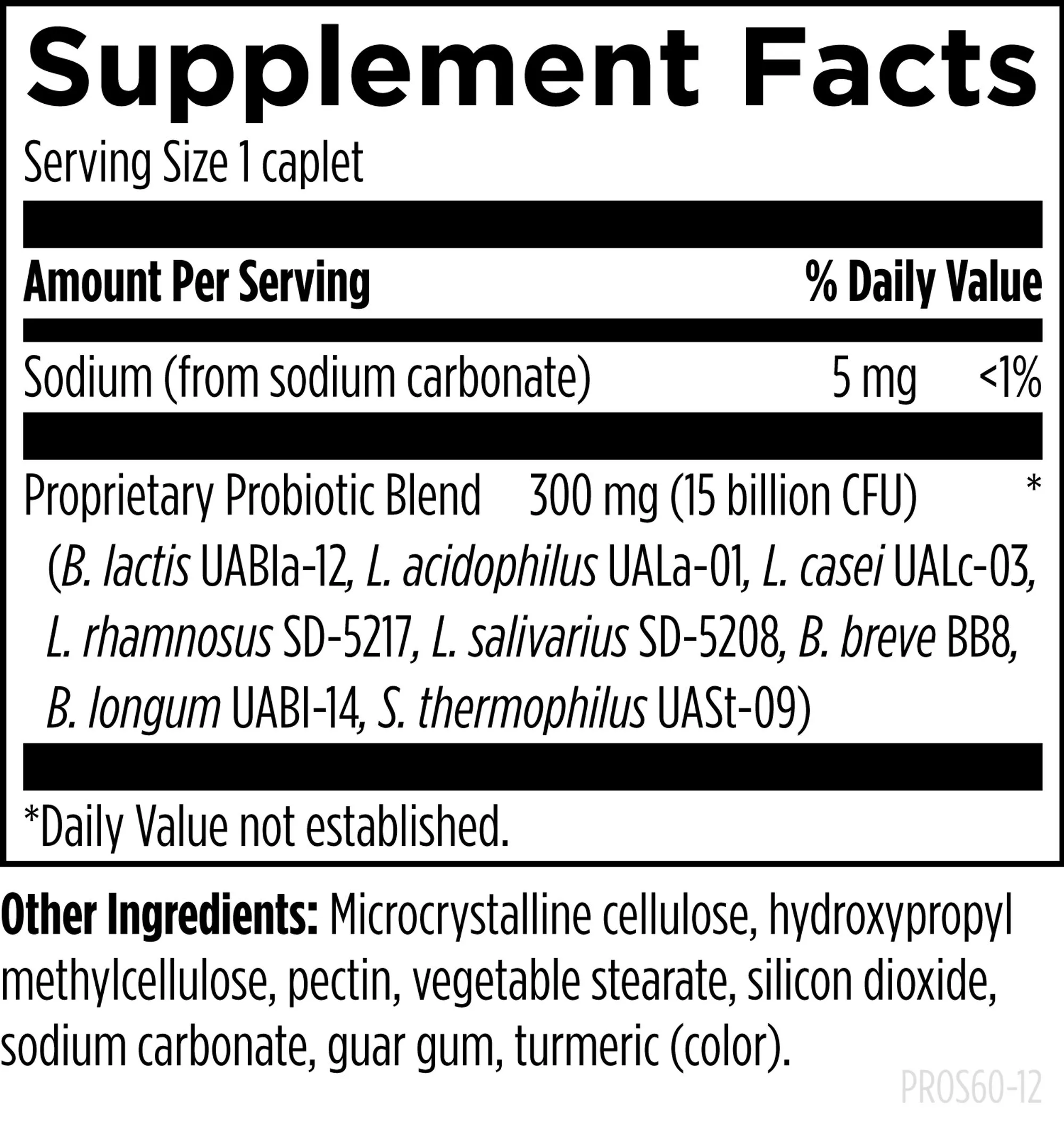 Proprietary Probiotic Blend (B. lactis BI-04, L. acidophilus La-14, L. casei Lc-11, L. rhamnosus Lr-32, L. salivarius Ls-33, B. breve Bb-03, B. longum BI-05, S. thermophilus St-21) (15 billion CFU), Microcrystalline cellulose, hydroxypropyl methylcellulose, pectin, vegetable stearate, silicon dioxide, sodium carbonate, guar gum, turmeric (color).