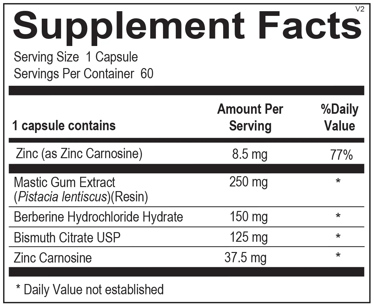 Zinc (as Zinc Carnosine), Mastic Gum Extract ((Pistacia lentiscus)(Resin)), Berberine Hydrochloride Hydrate, Bismuth Citrate USP, Zinc Carnosine, null