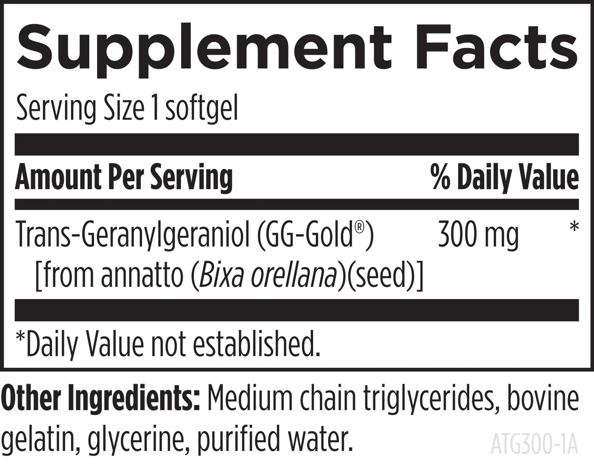 Trans-Geranylgeraniol (GG-Gold®) [from annatto (Bixa orellana)(seed)], Medium chain triglycerides, bovine gelatin, glycerine, purified water.