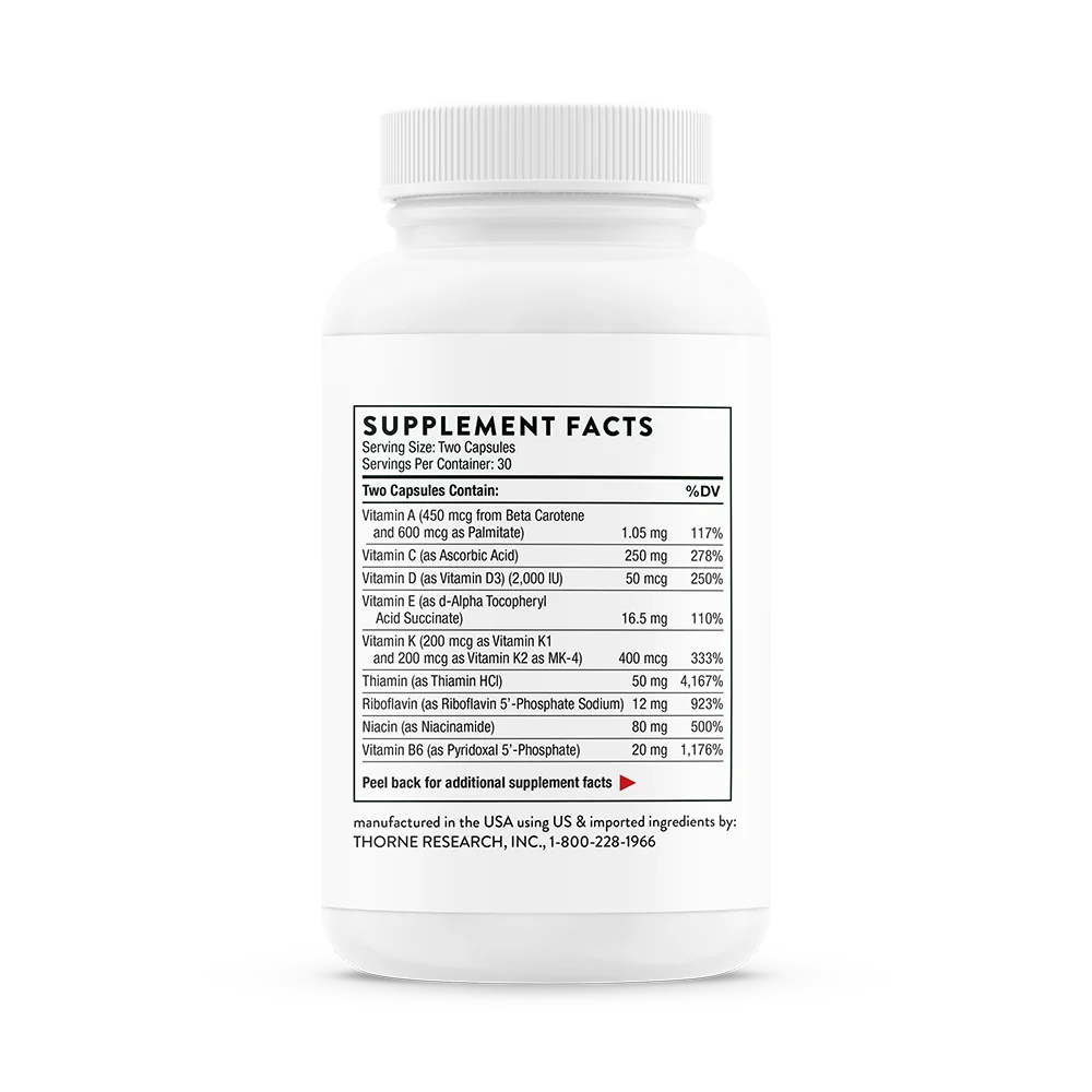 Vitamin A (450 mcg from Beta Carotene and 600 mcg as Palmitate), Vitamin C (as Ascorbic Acid), Vitamin D (as Vitamin D3) (2,000 IU), Vitamin E (as d-Alpha Tocopheryl Acid Succinate), Vitamin K (200 mcg as Vitamin K1 and 200 mcg as Vitamin K2 as MK-4), Thiamin (as Thiamin HCl), Riboflavin (as Riboflavin 5'-Phosphate Sodium), Niacin (as Niacinamide), Vitamin B6 (as Pyridoxal 5'-Phosphate), Folate (400 mcg as L-5-Methyltetrahydrofolate from L-5-Methyltetrahydrofolic Acid, Glucosamine Salt), Vitamin B12 (as Methylcobalamin), Biotin, Pantothenic Acid (as Calcium Pantothenate), Calcium (as TRAACS® Calcium Bisglycinate Chelate, Dicalcium Phosphate, Calcium Laurate, Calcium Pantothenate), Iodine (as Potassium Iodide), Magnesium (as TRAACS® Magnesium Bisglycinate Chelate), Zinc (as TRAACS® Zinc Bisglycinate Chelate), Selenium (as L-Selenomethionine), Copper (as TRAACS® Copper Bisglycinate Chelate), Manganese (as TRAACS® Manganese Bisglycinate Chelate), Chromium (as TRAACS® Chromium Nicotinate Glycinate Chelate), d-Gamma Tocopherol (from Mixed Tocopherols), Boron (as Bororganic™ Boron Glycinate Complex), Lutein (from Aztec Marigold extract (flower) (Tagetes erecta)), Hypromellose (derived from cellulose) capsule, Dicalcium Phosphate, Calcium Laurate. Gamma tocopherol does not have a recognized IU equivalent.
