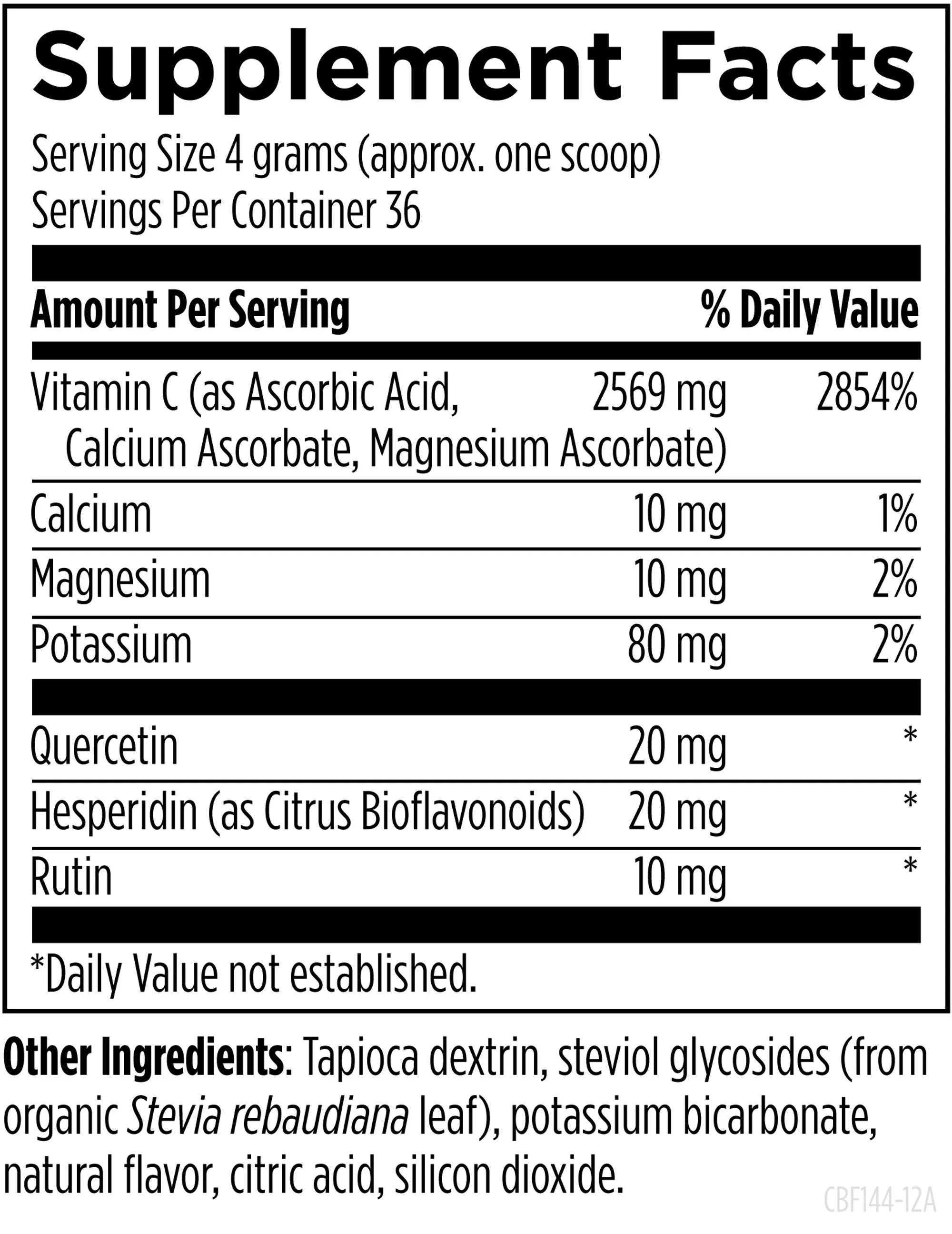 Vitamin C (as Ascorbic Acid, Calcium Ascorbate, Magnesium Ascorbate), Calcium, Magnesium, Potassium, Quercetin, Hesperidin (as Citrus Bioflavonoids), Rutin, Tapioca dextrin, steviol glycosides (from organic Stevia rebaudiana leaf), potassium bicarbonate, natural flavor, citric acid, silicon dioxide.