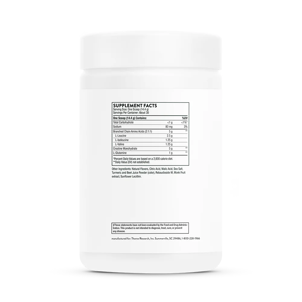 Sodium, L-Leucine, L-Isoleucine, L-Valine, Creatine Monohydrate, L-Glutamine, Natural Flavors, Citric Acid, Malic Acid, Sea Salt, Turmeric and Beet Juice Powder (color), Rebaudioside M, Monk Fruit extract, Sunflower Lecithin.
