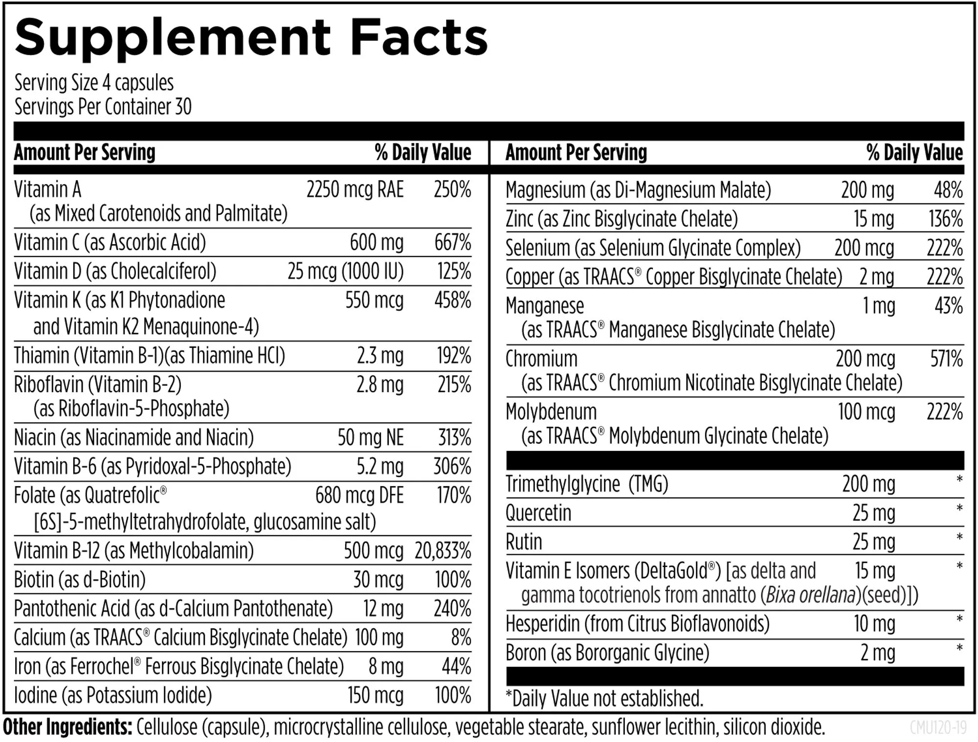 Vitamin A (as Mixed Carotenoids and Palmitate), Vitamin C (as Ascorbic Acid), Vitamin D (as Cholecalciferol), Vitamin K (as K1 Phytonadione and Vitamin K2 Menaquinone-4), Thiamin (Vitamin B-1)(as Thiamine HCl), Riboflavin (Vitamin B-2)(as Riboflavin-5-Phosphate), Niacin (as Niacinamide and Niacin), Vitamin B-6 (as Pyridoxal-5-Phosphate), Folate (as Quatrefolic® [6S]-5-methyltetrahydrofolate, glucosamine salt), Vitamin B-12 (as Methylcobalamin [MecobalActive®]), Biotin (as d-Biotin), Pantothenic Acid (as d-Calcium Pantothenate), Calcium (as TRAACS® Calcium Bisglycinate Chelate), Iron (as Ferrochel® Ferrous Bisglycinate Chelate), Iodine (as Potassium Iodide), Magnesium (as Di-Magnesium Malate), Zinc (as Zinc Bisglycinate Chelate), Selenium (as Selenium Glycinate Complex), Copper (as TRAACS® Copper Bisglycinate Chelate), Manganese (as TRAACS® Manganese Bisglycinate Chelate), Chromium (as TRAACS® Chromium Nicotinate Bisglycinate Chelate), Molybdenum (as TRAACS® Molybdenum Glycinate Chelate), Trimethylglycine (TMG), Quercetin, Rutin, Vitamin E Isomers (as DeltaGold® delta and gamma tocotrienols), Hesperidin (from Citrus Bioflavonoids), Boron (as Bororganic Glycine), Cellulose (capsule), microcrystalline cellulose, vegetable stearate, sunflower lecithin, silicon dioxide.