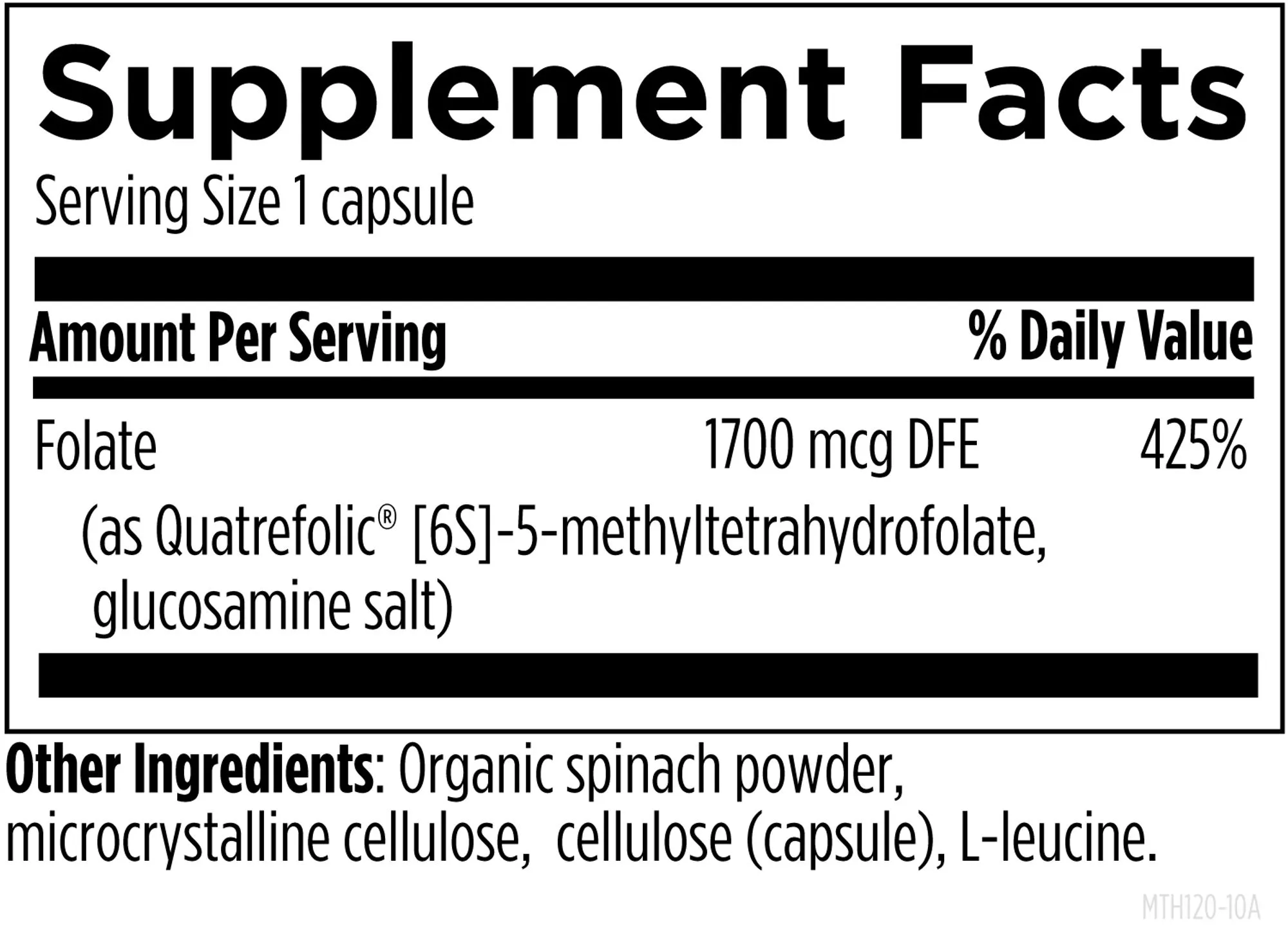 Folate (as Quatrefolic® [6S]-5-methyltetrahydrofolate, glucosamine salt), Organic spinach powder, microcrystalline cellulose, cellulose (capsule), L-leucine.