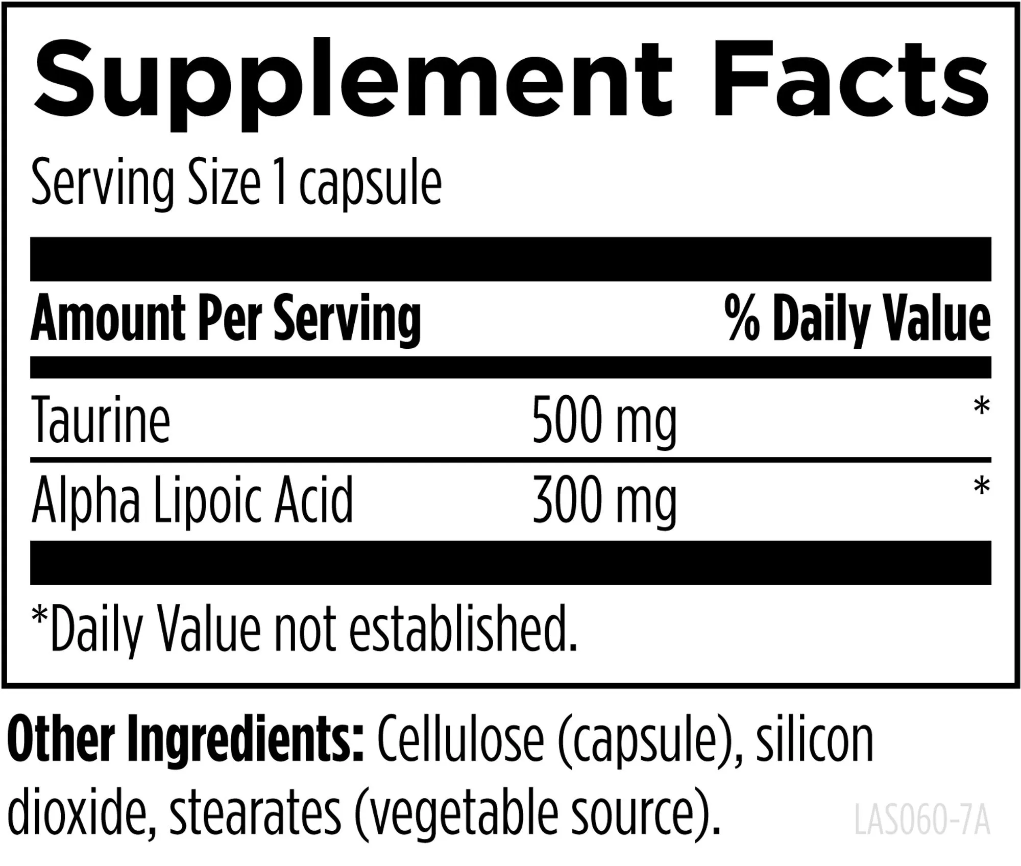 Taurine, Alpha Lipoic Acid, Cellulose (capsule), silicon dioxide, stearates (vegetable source).