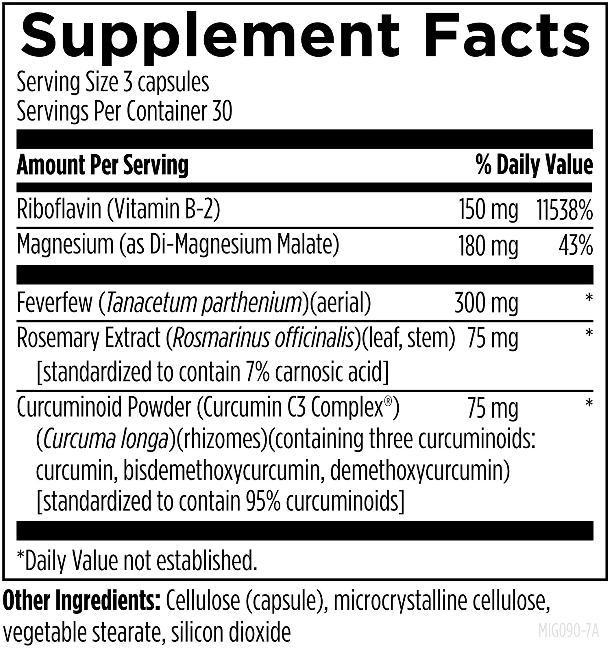 Riboflavin (Vitamin B-2), Magnesium (as Di-Magnesium Malate), Feverfew (Tanacetum parthenium)(aerial), Rosemary Extract (Rosmarinus officinalis) (leaf, stem)[standardized to contain 7% carnosic acid], Curcuminoid Powder (Curcumin C3 Complex®) (Curcuma longa)(rhizomes)(containing three curcuminoids: curcumin, bisdemethoxycurcumin, demethoxycurcumin) [standardized to contain 95% curcuminoids], Cellulose (capsule), microcrystalline cellulose, vegetable stearate, silicon dioxide