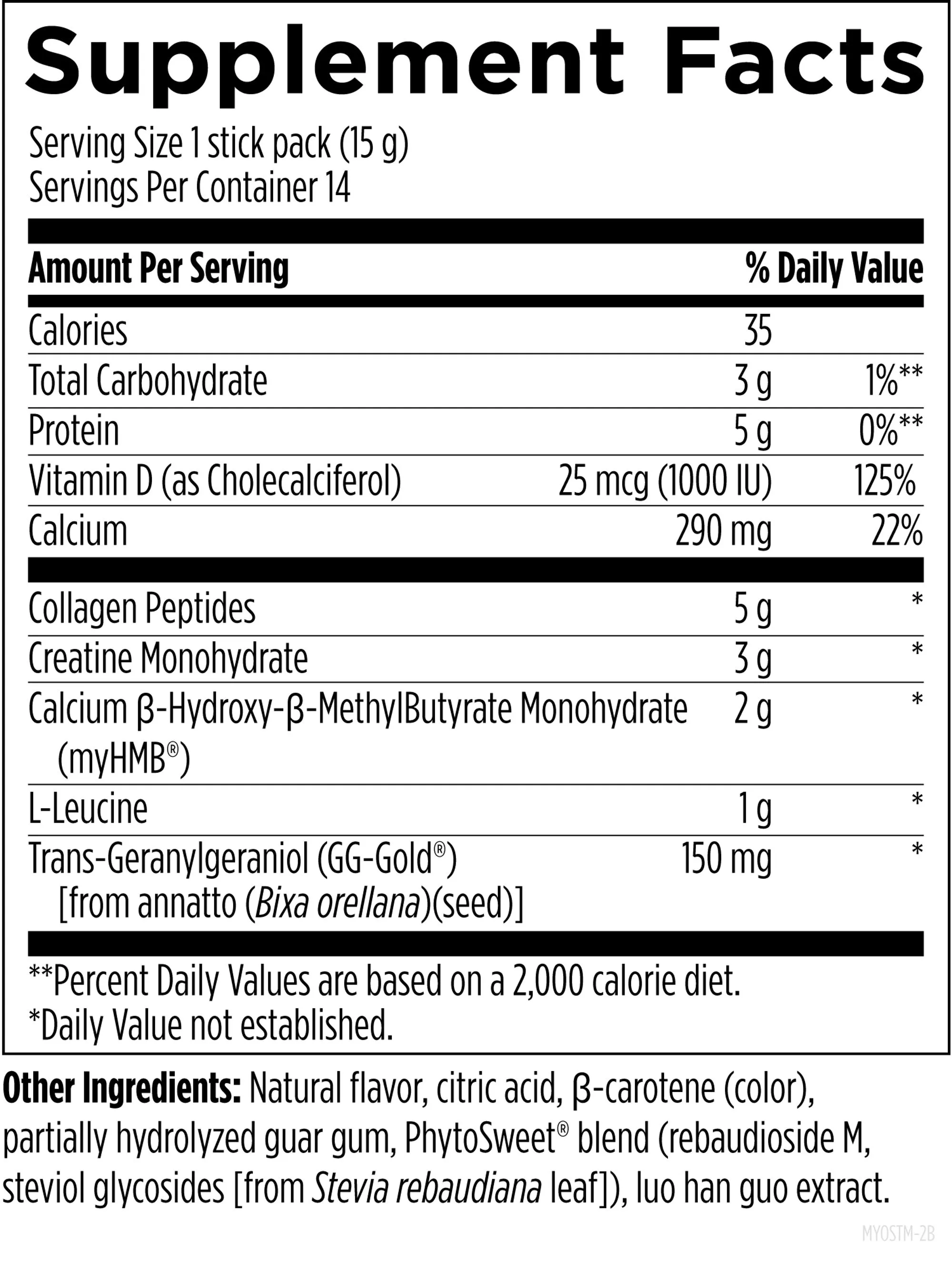 Total Carbohydrate, Protein, Vitamin D (as Cholecalciferol), Calcium, Collagen Peptides, Creatine Monohydrate, Calcium β-Hydroxy-β-MethylButyrate Monohydrate (myHMB®), L-Leucine, Trans-Geranylgeraniol (GG-Gold®) [from annatto (Bixa orellana)(seed)], Natural flavor, citric acid, β-carotene (color), partially hydrolyzed guar gum, PhytoSweet® blend (rebaudioside M, steviol glycosides [from Stevia rebaudiana leaf]), luo han guo extract.