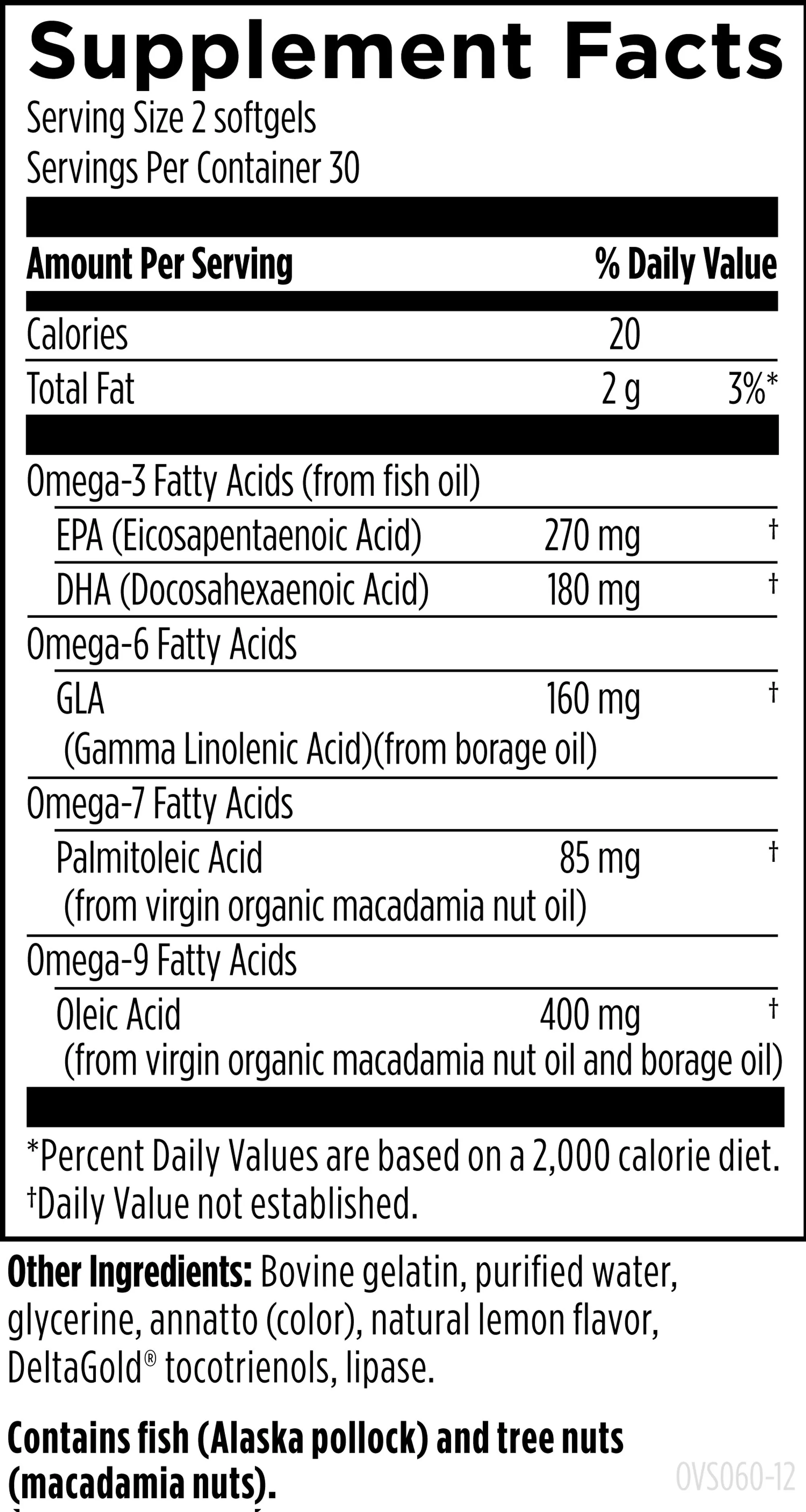 Total Fat, Cholesterol, EPA (Eicosapentaenoic Acid) (from fish oil), DHA (Docosahexaenoic Acid) (from fish oil), GLA (Gamma Linolenic Acid) (from borage oil), Palmitoleic Acid (from virgin organic macadamia nut oil), Oleic Acid (from virgin organic macadamia nut oil and borage oil), Bovine gelatin, purified water, glycerine, annatto (color), natural lemon flavor, DeltaGold® tocotrienols, lipase.