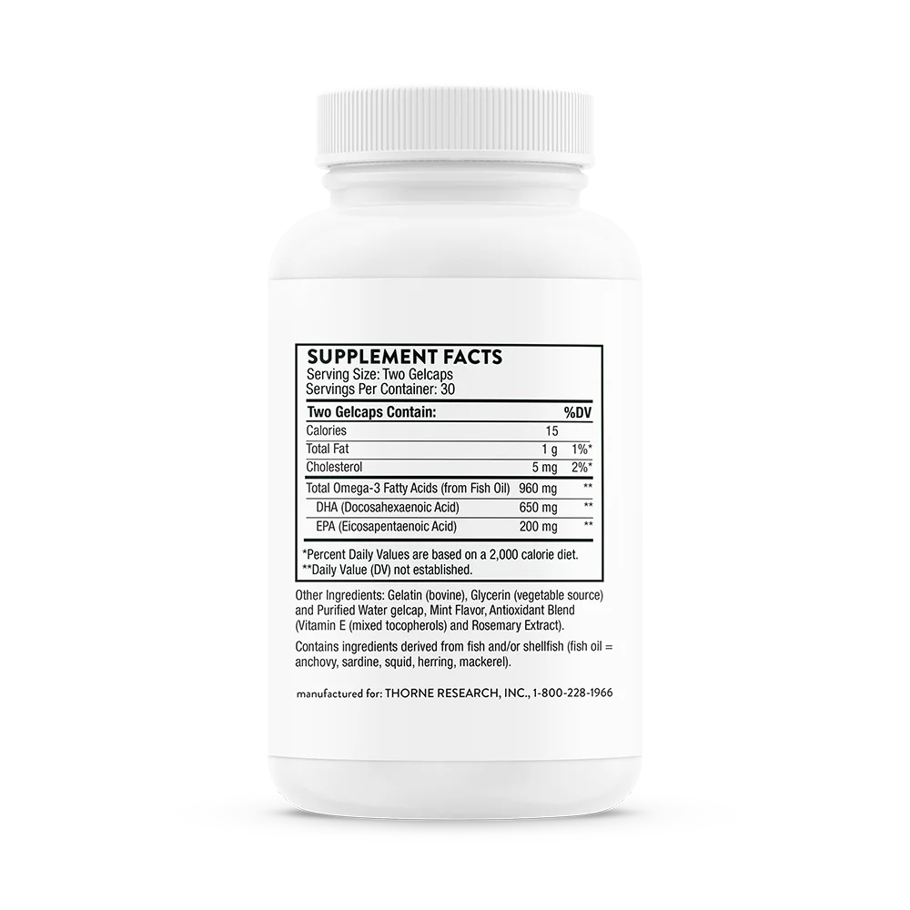 Total Fat, Cholesterol, Total Omega-3 Fatty Acids (from Fish Oil), DHA (Docosahexaenoic Acid), EPA (Eicosapentaenoic Acid), Gelatin (bovine), Glycerin (vegetable source) and Purified Water gelcap, Mint Flavor, Antioxidant Blend (Vitamin E (mixed tocopherols) and Rosemary Extract). Contains ingredients derived from fish and/or shellfish (fish oil = anchovy, sardine, squid, herring, mackerel).