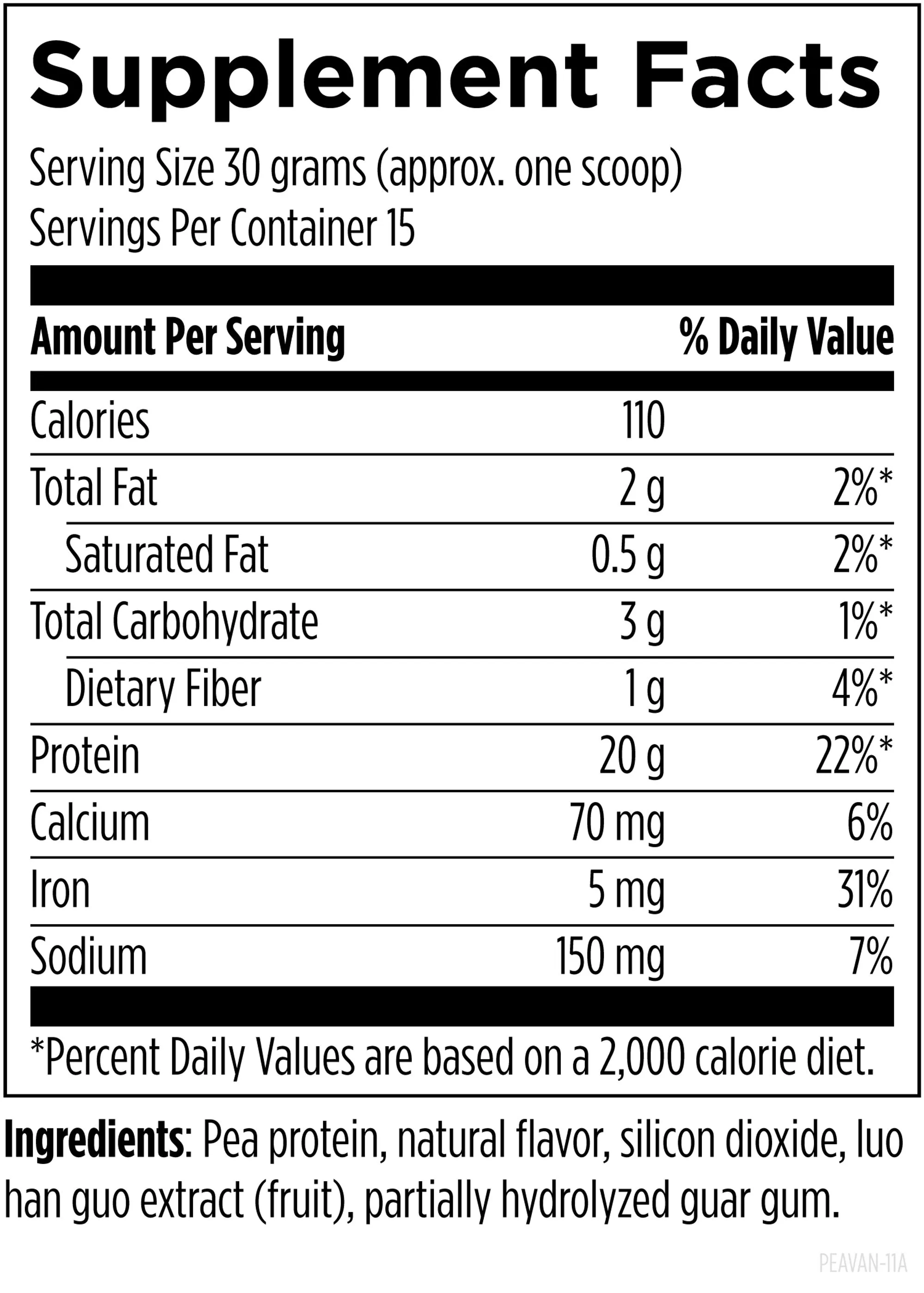 Total Fat, Saturated Fat, Total Carbohydrate, Dietary Fiber, Protein, Calcium, Iron, Sodium, Pea protein, natural flavor, certified organic stevia leaf extract powder (Stevia rebaudiana), silicon dioxide.