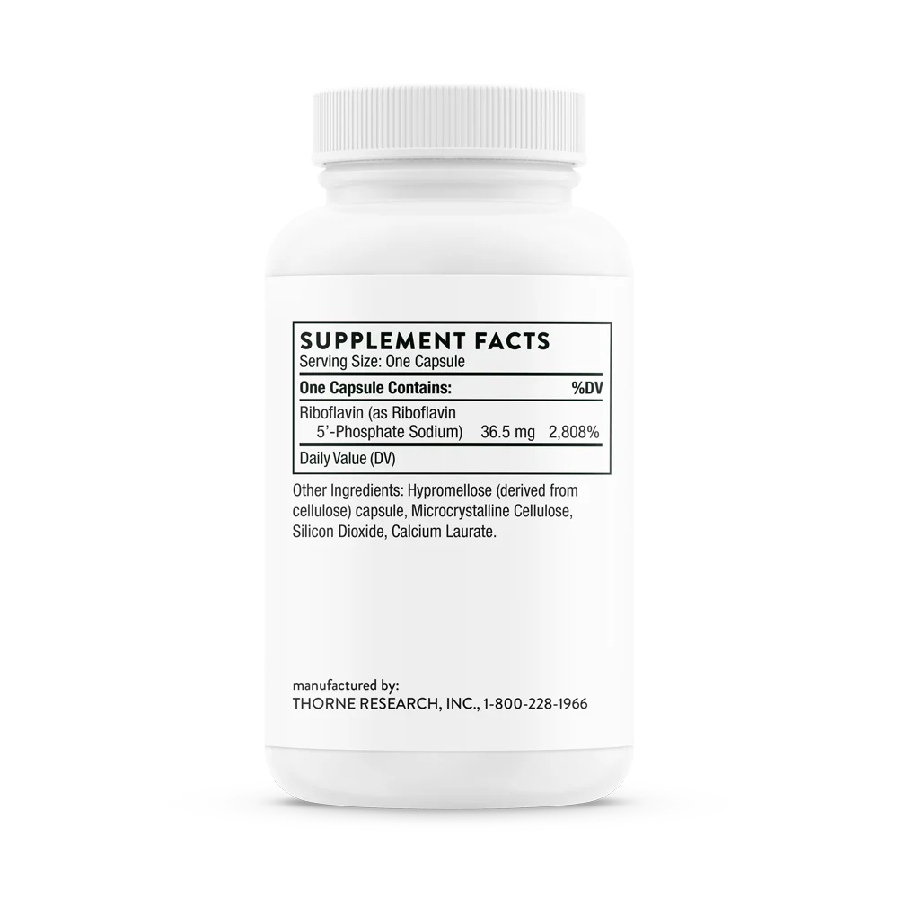 Riboflavin (as Riboflavin 5'-Phosphate Sodium), Hypromellose (derived from cellulose) capsule, Microcrystalline Cellulose, Silicon Dioxide, Calcium Laurate.