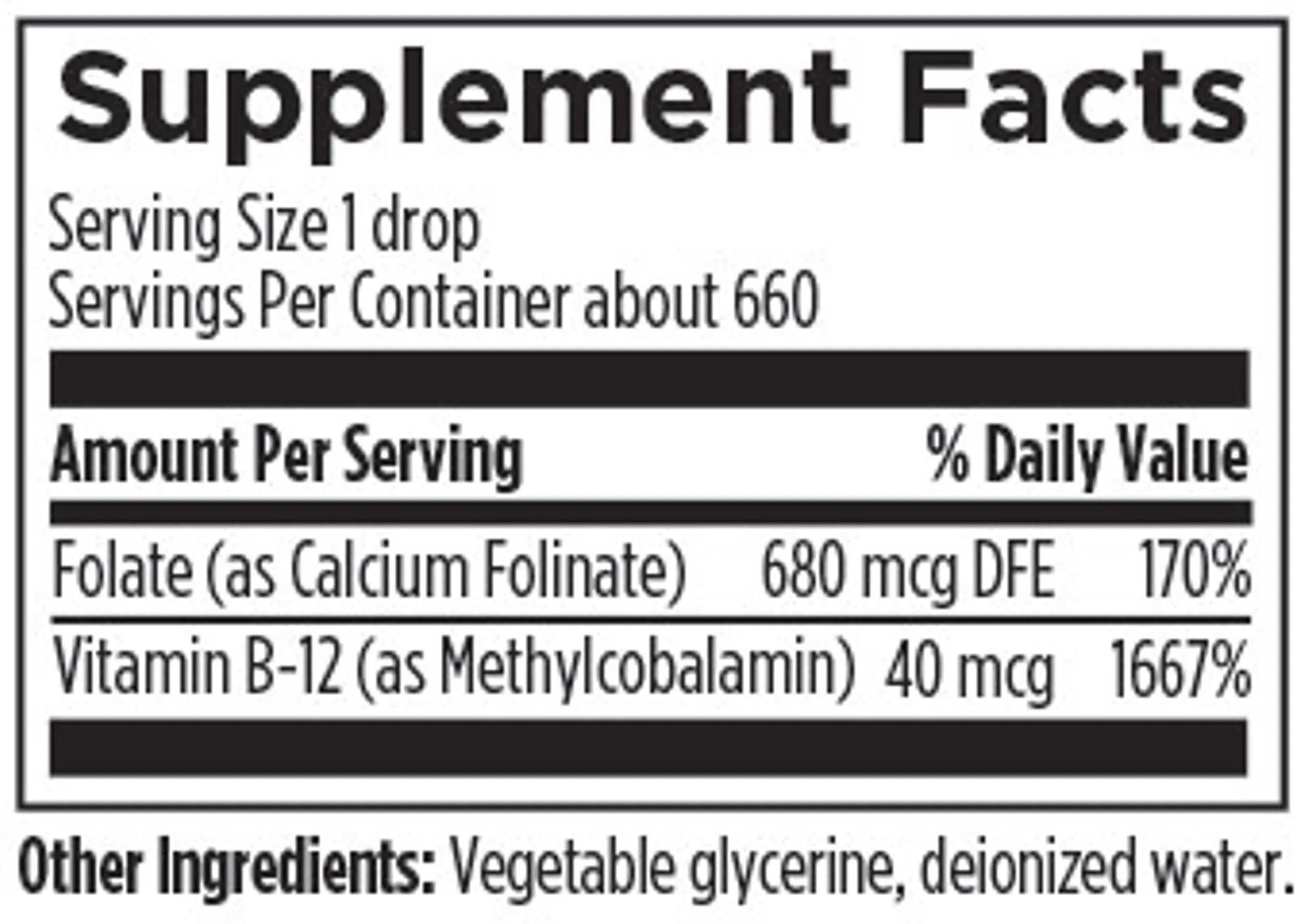 Folate (as Calcium Folinate), Vitamin B-12 (as Methylcobalamin), Vegetable glycerin, deionized water.