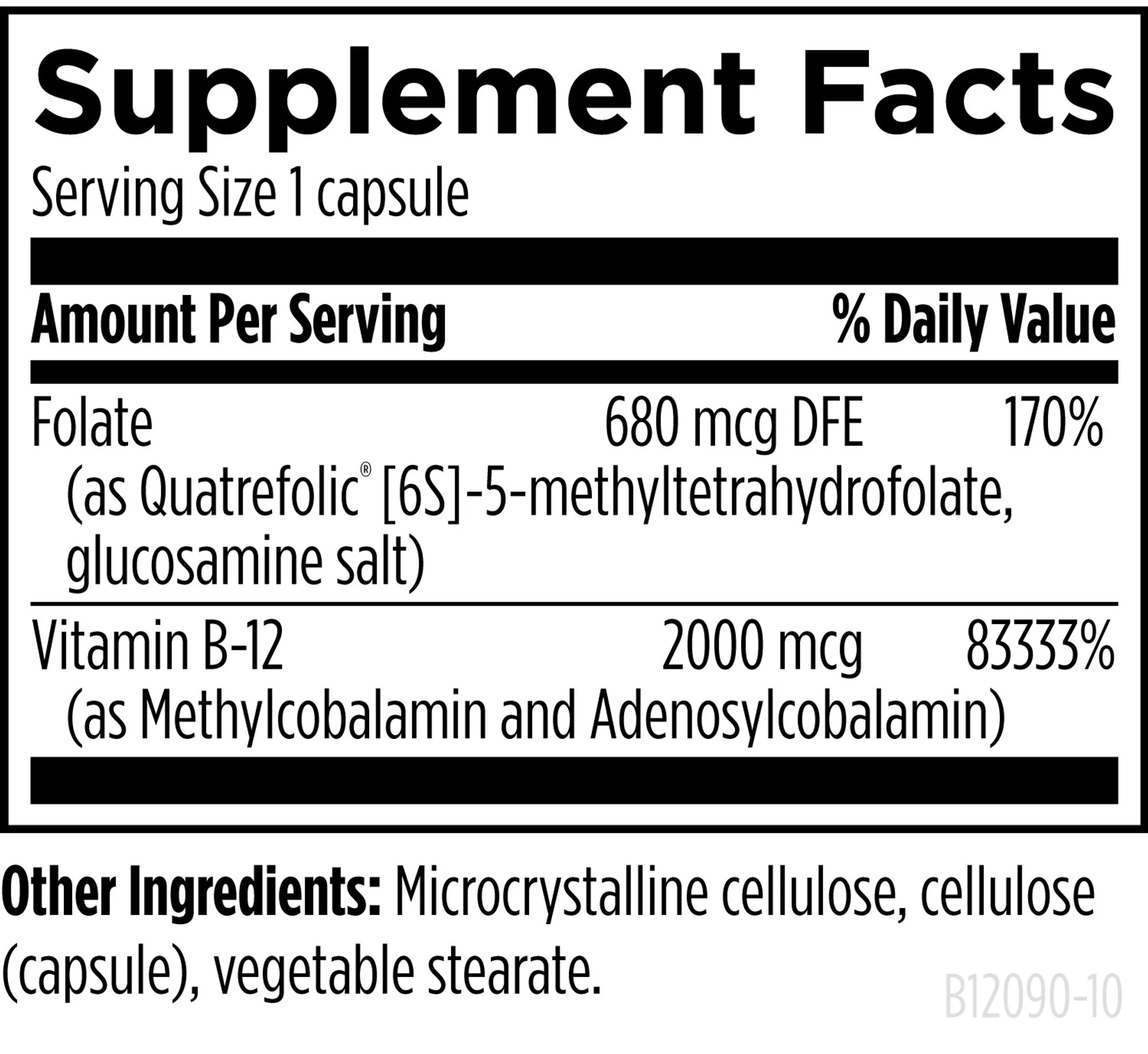 Folate (as Quatrefolic® [6S]-5-methyltetrahydrofolate, glucosamine salt), Vitamin B-12 (as Methylcobalamin [MecobalActive®] and Adenosylcobalamin), Microcrystalline cellulose, cellulose (capsule), vegetable stearate.