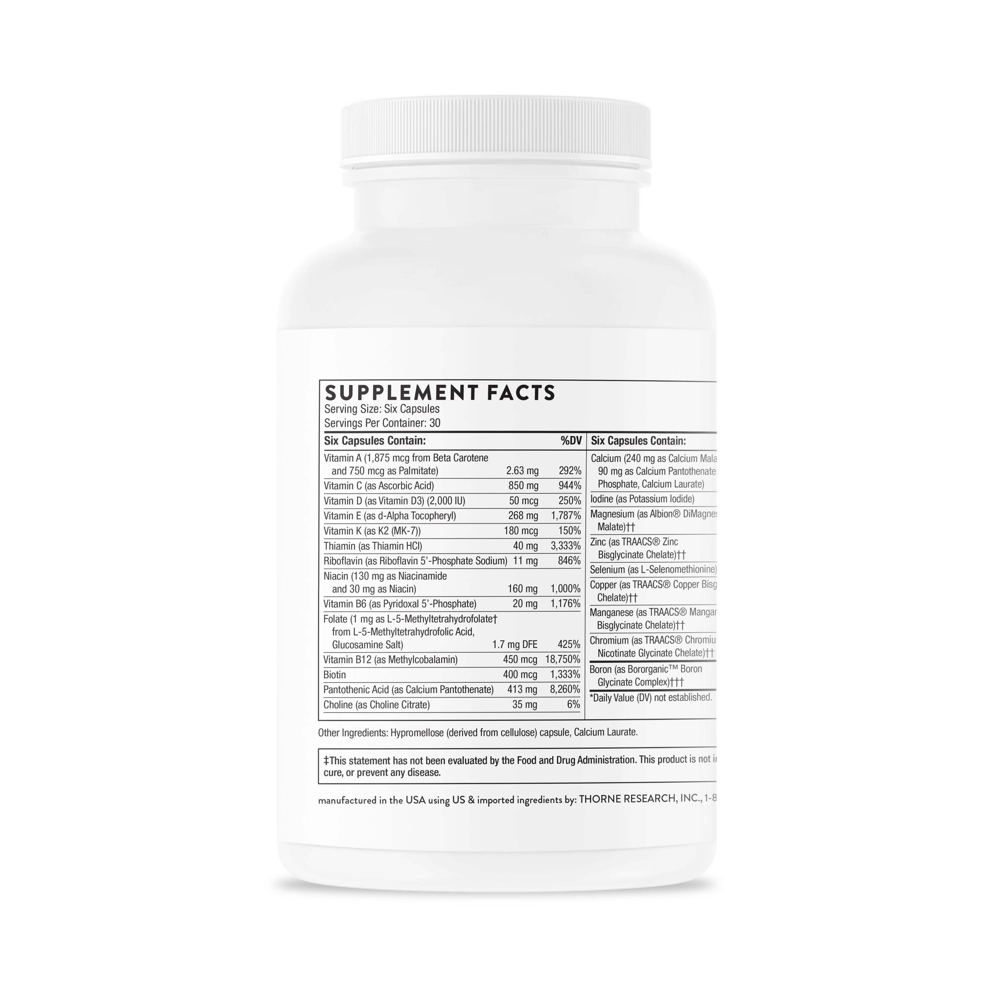 Vitamin A (1,875 mcg from Beta Carotene and 750 mcg as Palmitate), Vitamin C (as Ascorbic Acid), Vitamin D (as Vitamin D3) (2,000 IU), Vitamin E (as d-Alpha Tocopheryl), Vitamin K (as K2 (MK-7)), Thiamin (as Thiamin HCl), Riboflavin (as Riboflavin 5'-Phosphate Sodium), Niacin (130 mg as Niacinamide and 30 mg as Niacin), Vitamin B6 (as Pyridoxal 5'-Phosphate), Folate (1 mg as L-5-Methyltetrahydrofolate from L-5-Methyltetrahydrofolic Acid, Glucosamine Salt), Vitamin B12 (as Methylcobalamin), Biotin, Pantothenic Acid (as Calcium Pantothenate), Choline (as Choline Citrate), Phosphate, Calcium Laurate), Iodine (as Potassium Iodide), Magnesium (as Albion® DiMagnesium Malate), Zinc (as TRAACS Zinc Bisglycinate Chelate), Selenium (as L-Selenomethionine), Copper (as TRAACS® Copper Bisglycinate Chelate), Manganese (as TRAACS Manganese Bisglycinate Chelate), Chromium (as TRAACS® Chromium Nicotinate Glycinate Chelate), Boron (as Bororganic™ Boron Glycinate Complex), Hypromellose (derived from cellulose) capsule, Calcium Laurate.