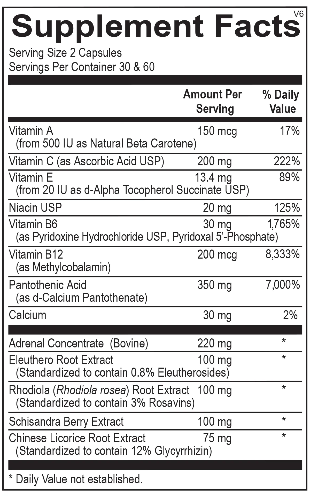 Vitamin A (from 500 IU as Natural Beta Carotene), Vitamin C (as Ascorbic Acid USP), Vitamin E (from 20 IU as d-Alpha Tocopherol Succinate USP), Niacin USP, Vitamin B6 (as Pyridoxine Hydrochloride USP, Pyridoxal 5'-Phosphate), Vitamin B12 (as Methylcobalamin), Pantothenic Acid (as d-Calcium Pantothenate), Calcium, Adrenal Concentrate (Bovine), Eleuthero Root Extract (Standardized to contain 0.8% Eleutherosides), Rhodiola (Rhodiola rosea) Root Extract (Standardized to contain 3% Rosavins), Schisandra Berry Extract, Chinese Licorice Root Extract (Standardized to contain 12% Glycyrrhizin)