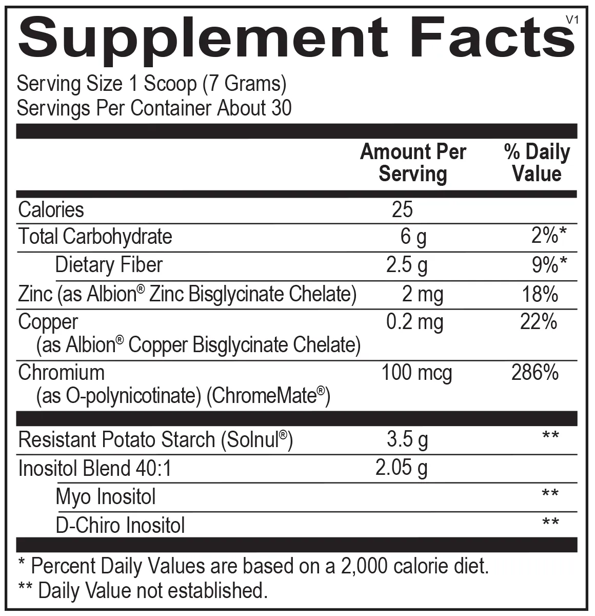 Calories, Total Carbohydrate, Dietary Fiber, Zinc (as Albion® Zinc Bisglycinate Chelate), Copper (as Albion® Copper Bisglycinate Chelate), Chromium (as O-polynicotinate) (ChromeMate®), Resistant Potato Starch (Solnul®), Inositol Blend 40:1