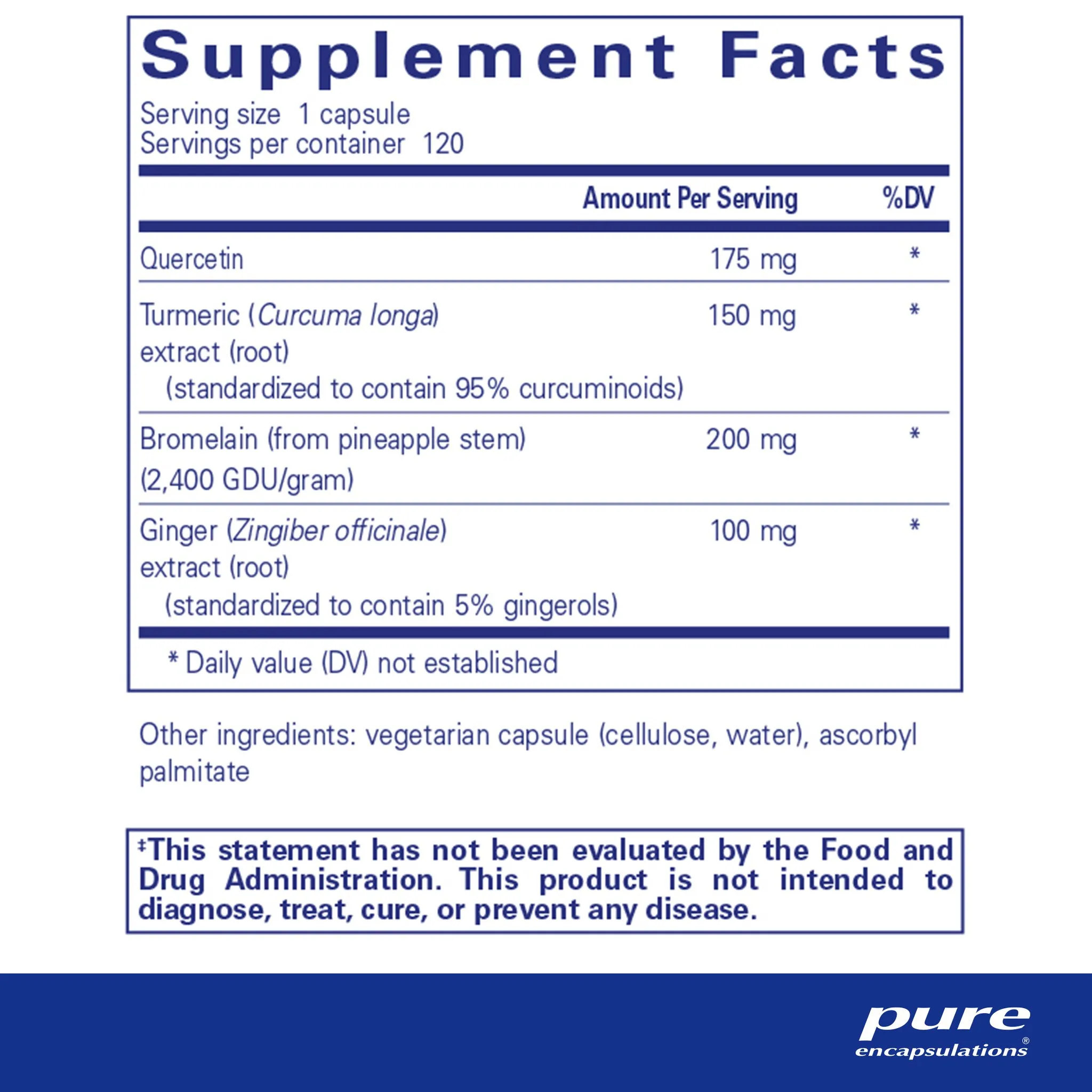 quercetin, turmeric (Curcuma longa) extract (root) (standardized to contain 95% curcuminoids), bromelain (2,400 GDU/gram), ginger (Zingiber officinale) extract (root) (standardized to contain 5% gingerols), vegetarian capsule (cellulose, water), ascorbyl palmitate