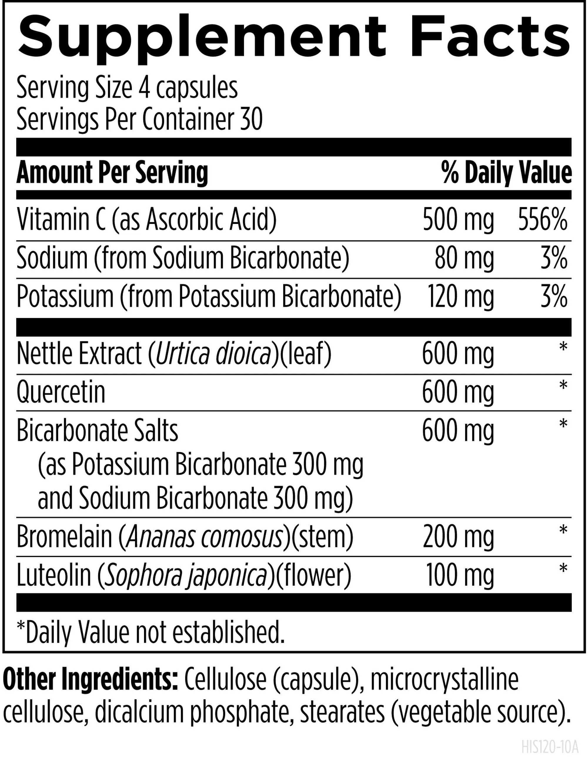 Vitamin C (as Ascorbic Acid), Sodium (from sodium bicarbonate), Potassium (from Potassium Bicarbonate), Guduchi (as Tinofend®) (Tinospora cordifolia)(stem), Nettle Extract (Urtica dioica)(leaf), Quercetin, Bicarbonate Salts (as Potassium Bicarbonate 300 mg and Sodium Bicarbonate 300 mg), Cellulose (capsule), microcrystalline cellulose, vegetable stearate.