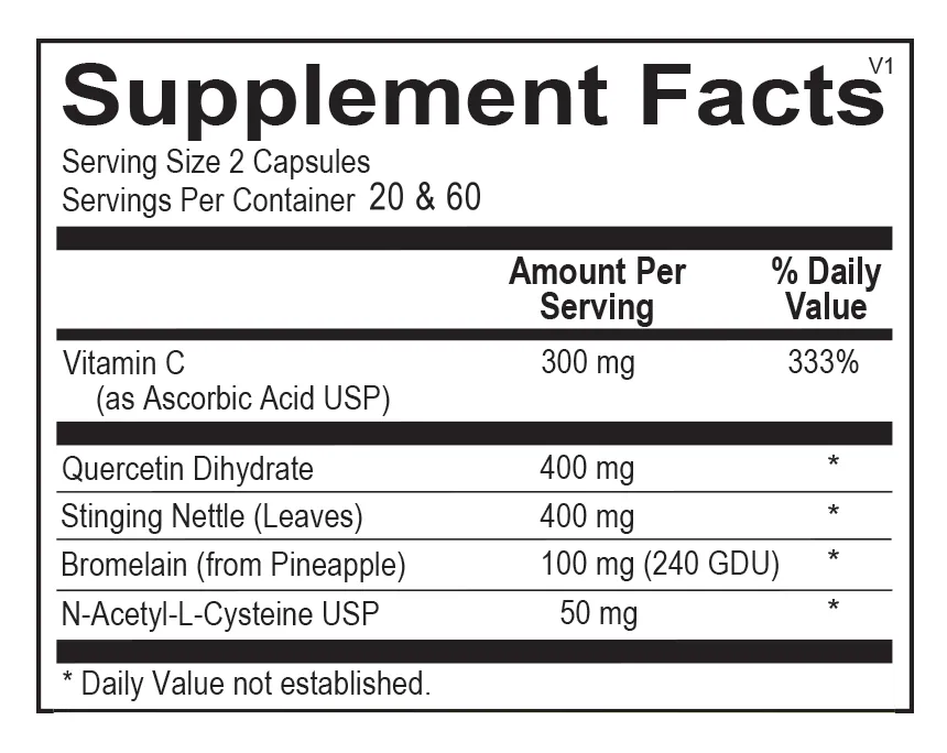 Vitamin C (as Ascorbic Acid USP), Quercetin Dihydrate, Stinging Nettle (Leaves), Bromelain (from Pineapple (240 GDU)), N-Acetyl-L-Cysteine (USP)