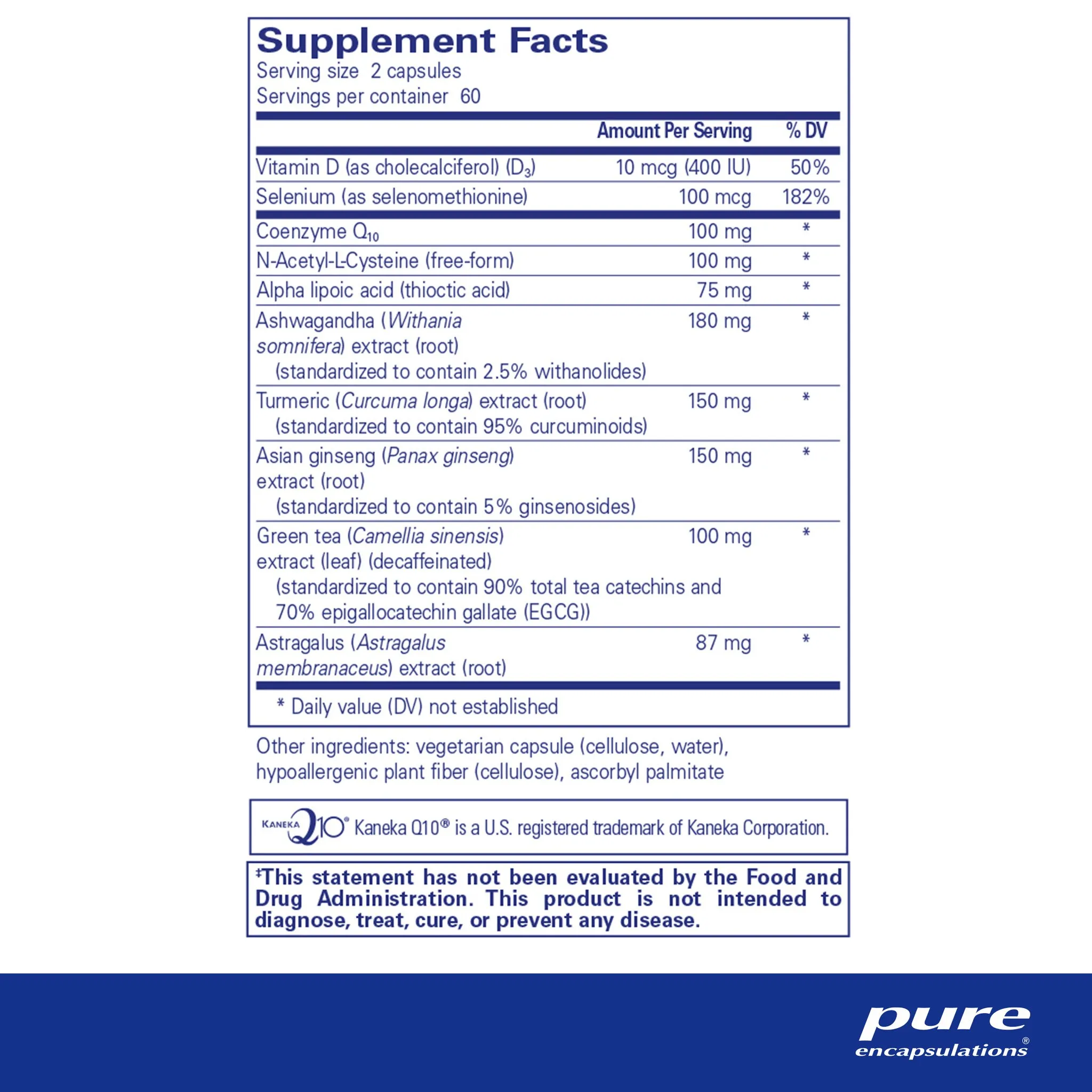 vitamin D (as cholecalciferol)(D3) (400 IU), selenium (as selenomethionine), coenzyme Q10, n-acetyl-l-cysteine (free-form), alpha lipoic acid (thioctic acid), ashwagandha (Withania somnifera) extract (root), turmeric (Curcuma longa) extract (root), asian ginseng (Panax ginseng) extract (root), green tea (Camellia sinensis) extract (leaf) (decaffeinated), astragalus (Astragalus membranaceus) extract (root), vegetarian capsule (cellulose, water), hypoallergenic plant fiber (cellulose), ascorbyl palmitate