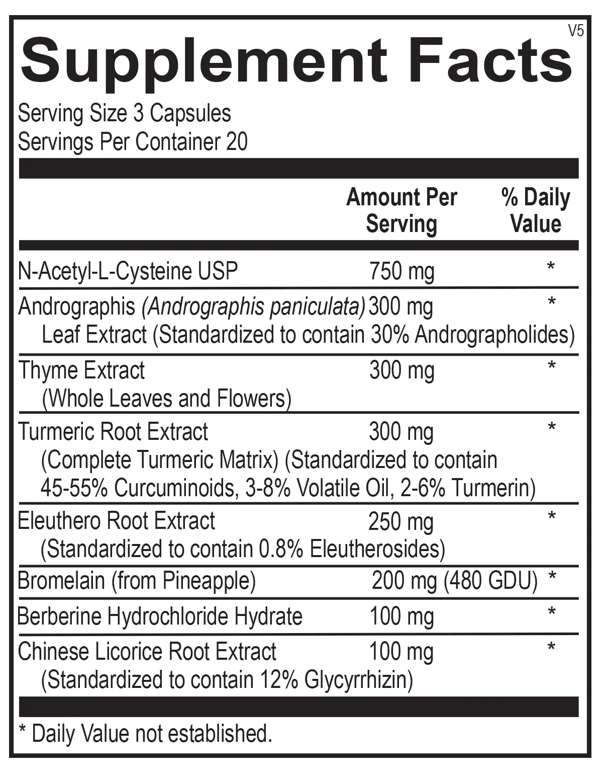 N-Acetyl-L-Cysteine (USP), Andrographis Leaf Extract ((Andrographis paniculata) (Standardized to contain 30% Andrographolides)), Thyme Extract ((Whole Leaves and Flowers)), Turmeric Root Extract ((Complete Turmeric Matrix) (Standardized to contain 45-55% Curcuminoids, 3-8% Volatile Oil, 2-6% Turmerin)), Eleuthero Root Extract ((Standardized to contain 0.8% Eleutherosides)), Bromelain ((from Pineapple) (480 GDU)), Berberine Hydrochloride Hydrate, Chinese Licorice Root Extract ((Standardized to contain 12% Glycyrrhizin))
