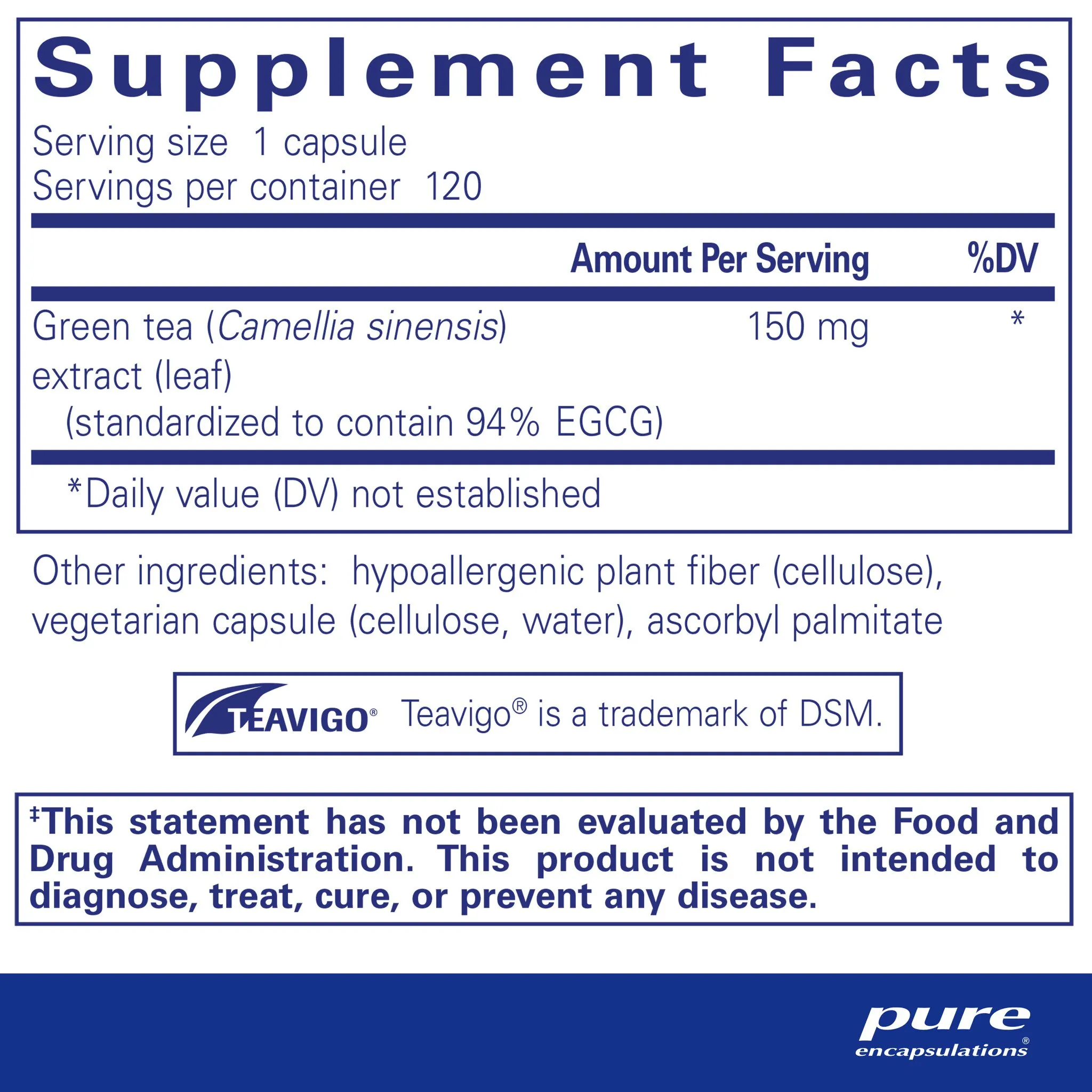 green tea (Camellia sinensis) extract (leaf) (standardized to contain 94% EGCG), hypoallergenic plant fiber (cellulose), vegetarian capsule (cellulose, water), ascorbyl palmitate