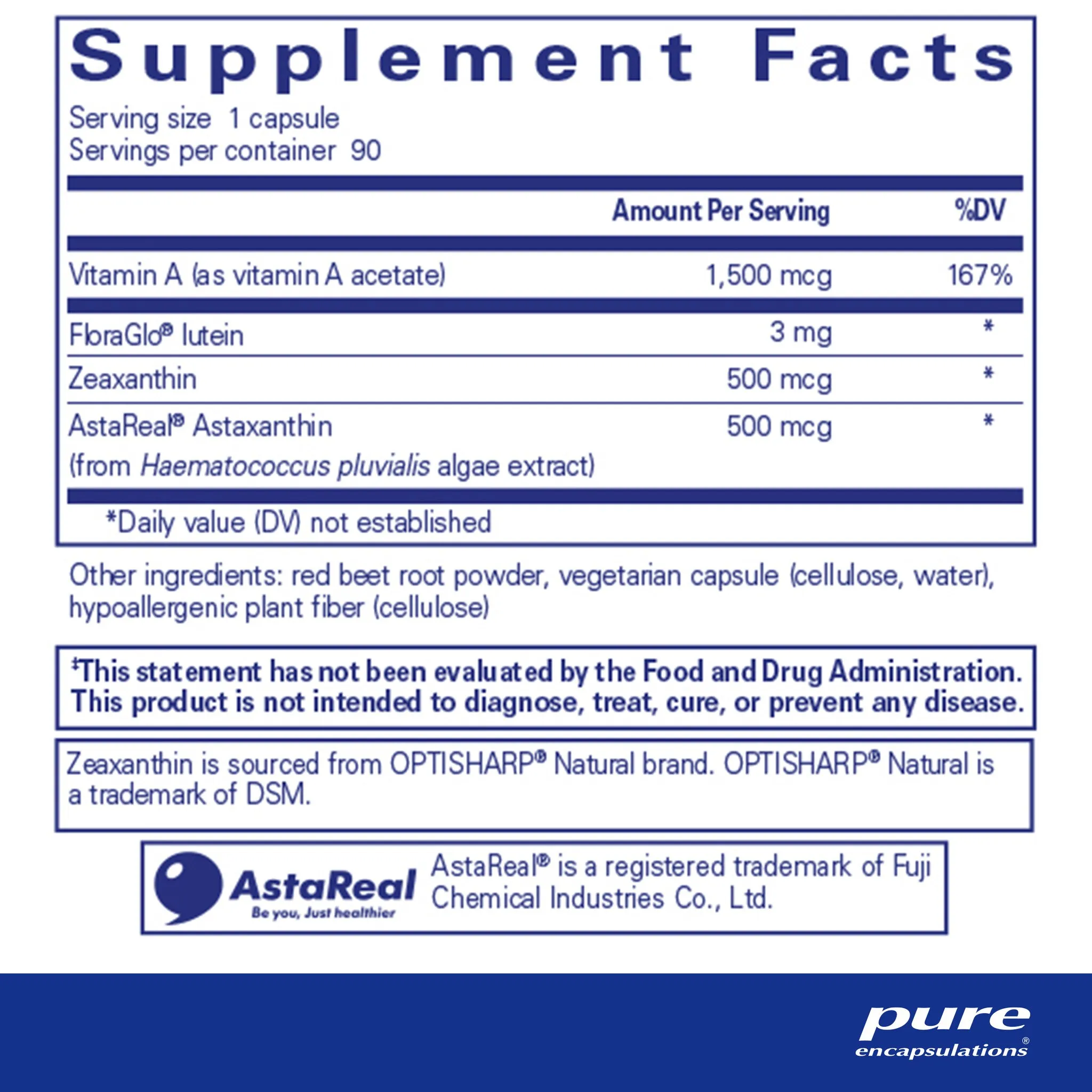 vitamin A (as vitamin A acetate), FloraGLO® lutein, zeaxanthin, AstaReal® Astaxanthin (from Haematococcus pluvialis algae extract), red beet root powder, hypoallergenic plant fiber (cellulose), vegetarian capsule (cellulose, water)