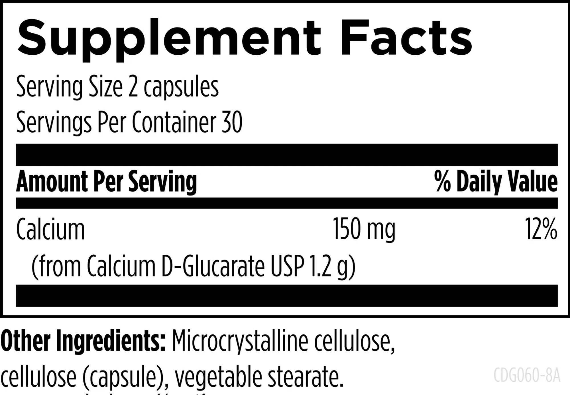 Calcium (from Calcium D-Glucarate USP 1.2 g), Microcrystalline cellulose, cellulose (capsule), vegetable stearate.
