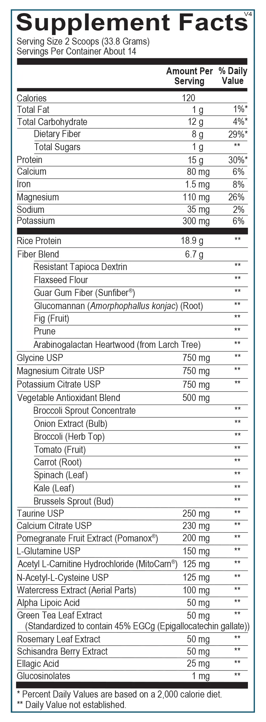 Calories, Total Fat, Total Carbohydrate, Dietary Fiber, Total Sugars, Protein, Calcium, Iron, Magnesium, Sodium, Potassium, Rice Protein, Fiber Blend, Glycine USP, Magnesium Citrate USP, Potassium Citrate USP, Vegetable Antioxidant Blend, Taurine USP, Calcium Citrate USP, Pomegranate Fruit Extract (Pomanox®), L-Glutamine USP, Acetyl L-Carnitine Hydrochloride (MitoCarn®), N-Acetyl-L-Cysteine USP, Watercress Extract (Aerial Parts), Alpha Lipoic Acid, Green Tea Leaf Extract (Standardized to contain 45% EGCg (Epigallocatechin gallate)), Rosemary Leaf Extract, Schisandra Berry Extract, Ellagic Acid, Glucosinolates