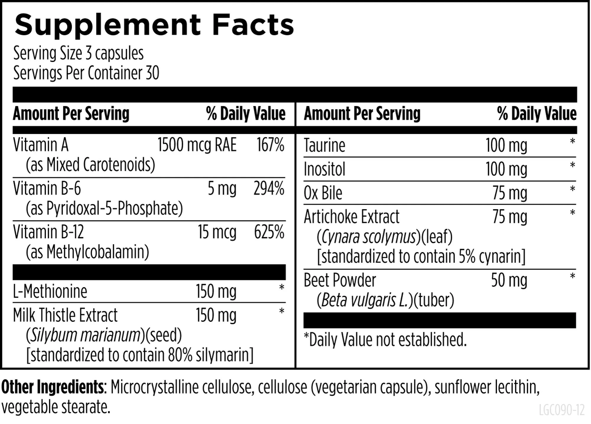 Vitamin A (as Mixed Carotenoids), Vitamin B-6 (as Pyridoxal-5-Phosphate), Vitamin B-12 (as Methylcobalamin [MecobalActive®]), L-Methionine, Milk Thistle Extract (Silybum marianum)(seed) [standardized to contain 80% silymarin], Taurine, Inositol, Ox Bile, Artichoke Extract (Cynara scolymus)(leaf) [standardized to contain 5% cynarin], Beet Powder (Beta vulgaris L.)(tuber), Microcrystalline cellulose, cellulose (vegetarian capsule), sunflower lecithin, vegetable stearate.