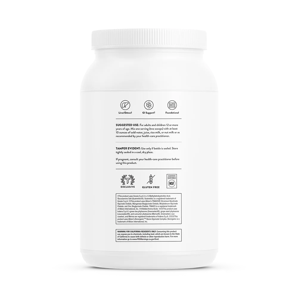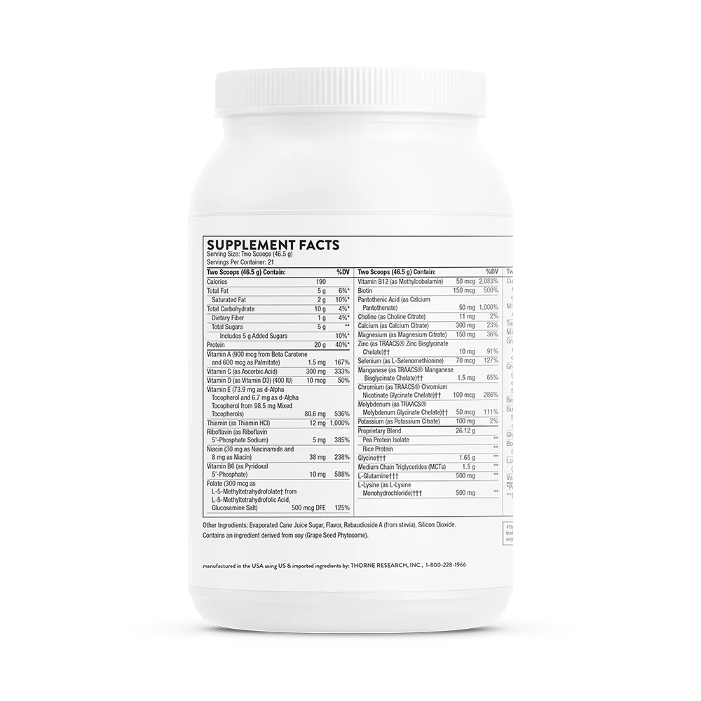 Total Fat, Saturated Fat, Total Carbohydrate, Dietary Fiber, Total Sugars, Protein, Vitamin A (900 mcg from Beta Carotene and 600 mcg as Palmitate), Vitamin C (as Ascorbic Acid), Vitamin D (as Vitamin D3) (400 IU), Vitamin E (73.9 mg as d-Alpha Tocopherol and 6.7 mg as d-Alpha Tocopherol from 98.5 mg Mixed Tocopherols), Thiamin (as Thiamin HCl), Riboflavin (as Riboflavin 5'-Phosphate Sodium), Niacin (30 mg as Niacinamide and 8 mg as Niacin), Vitamin B6 (as Pyridoxal 5'-Phosphate), Folate (300 mcg as L-5-Methyltetrahydrofolate from L-5-Methyltetrahydrofolic Acid, Glucosamine Salt), Vitamin B12 (as Methylcobalamin), Biotin, Pantothenic Acid (as Calcium Pantothenate), Choline (as Choline Citrate), Calcium (as Calcium Citrate), Magnesium (as Magnesium Citrate), Zinc (as TRAACS® Zinc Bisglycinate Chelate), Selenium (as L-Selenomethionine), Manganese (as TRAACS® Manganese Bisglycinate Chelate), Chromium (as TRAACS® Chromium Nicotinate Glycinate Chelate), Molybdenum (as TRAACS® Molybdenum Glycinate Chelate), Potassium (as Potassium Citrate), Proprietary Blend, Glycine, Medium Chain Triglycerides (MCTs), L-Glutamine, L-Lysine (as L-Lysine Monohydrochloride), Curcumin Phytosome (Curcuma longa extract (root) / Phospholipid complex from Sunflower), Milk Thistle extract (fruit) (Silybum marianum), Taurine, Methyl Sulfonyl Methane (MSM), Grape Seed Phytosome (Vitis vinifera extract / Phospholipid complex), Green Tea Phytosome (Camellia sinensis extract (leaf) decaffeinated / Phospholipid complex from Sunflower), Betaine Anhydrous (Trimethylglycine), Sulforaphane Glucosinolate (from Broccoli extract (seed) (Brassica oleracea italica)), Glutathione (Reduced), Boron (as Bororganic™ Boron Glycinate Complex), Lutein (from Aztec Marigold extract (flower) (Tagetes erecta)), Vanadium (as Vanadium Citrate), Evaporated Cane Juice Sugar, Flavor, Rebaudioside A (from stevia), Silicon Dioxide. Contains an ingredient derived from soy (Grape Seed Phytosome).