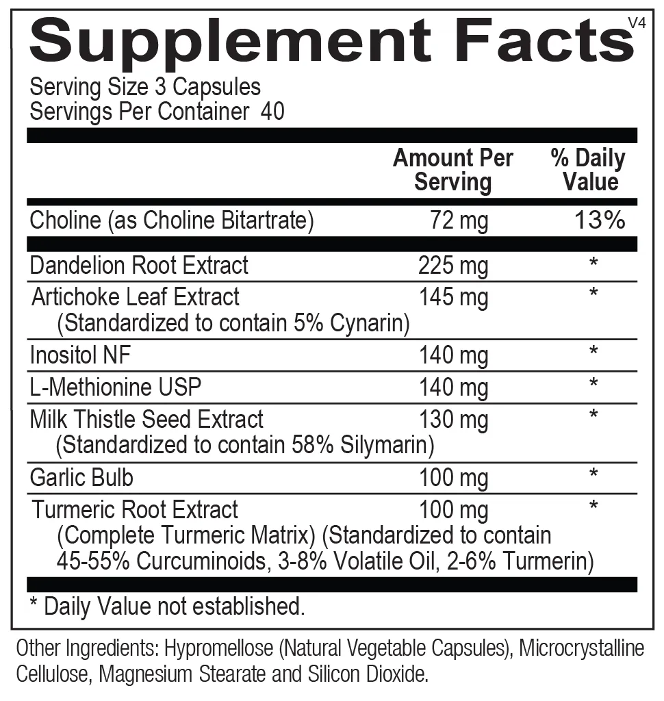 Choline (as Choline Bitartrate), Dandelion Root Extract, Artichoke Leaf Extract (Standardized to contain 5% Cynarin), Inositol NF, L-Methionine USP, Milk Thistle Seed Extract (Standardized to contain 58% Silymarin), Garlic Bulb, Turmeric Root Extract ((Complete Turmeric Matrix) (Standardized to contain 45-55% Curcuminoids, 3-8% Volatile Oil, 2-6% Turmerin)), Hypromellose (Natural Vegetable Capsules), Microcrystalline Cellulose, Magnesium Stearate and Silicon Dioxide.