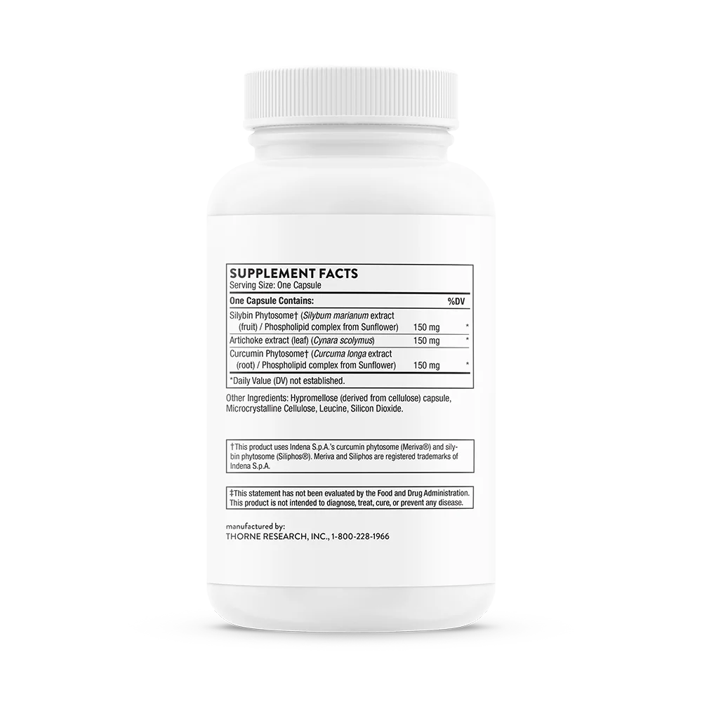 Silybin Phytosome (Silybum marianum extract (fruit) / Phospholipid complex from Sunflower)), Artichoke extract (leaf) (Cynara scolymus), Curcumin Phytosome (Curcuma longa extract (root) / Phospholipid complex from Sunflower)), Hypromellose (derived from cellulose) capsule, Microcrystalline Cellulose, Leucine, Silicon Dioxide.