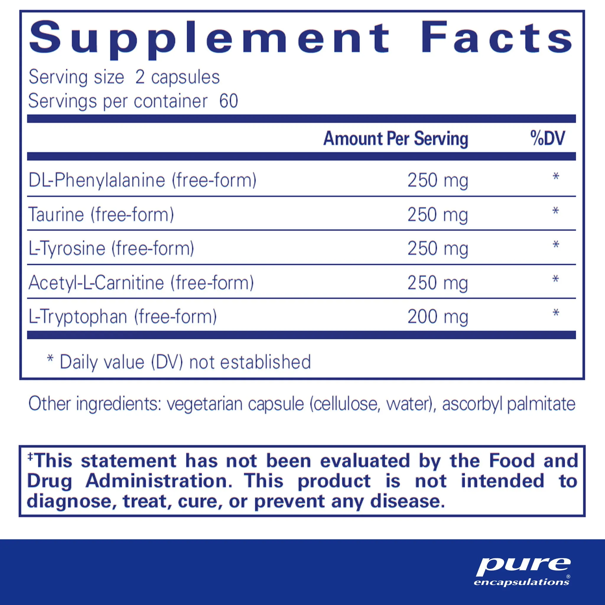 DL-phenylalanine (free-form), taurine (free-form), l-tyrosine (free-form), acetyl-l-carnitine, l-tryptophan (free-form), vegetarian capsule (cellulose, water), ascorbyl palmitate