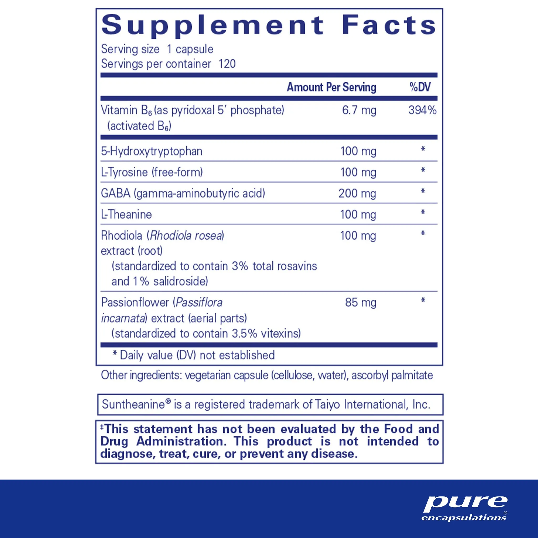 5-hydroxytryptophan, l-tyrosine (free-form), GABA (gamma-aminobutyric acid), l-theanine, rhodiola (Rhodiola rosea) extract (root), passionflower (Passiflora incarnata) extract (aerial parts), vitamin B6 (as pyridoxal 5' phosphate) (activated B6), vegetarian capsule (cellulose, water), ascorbyl palmitate