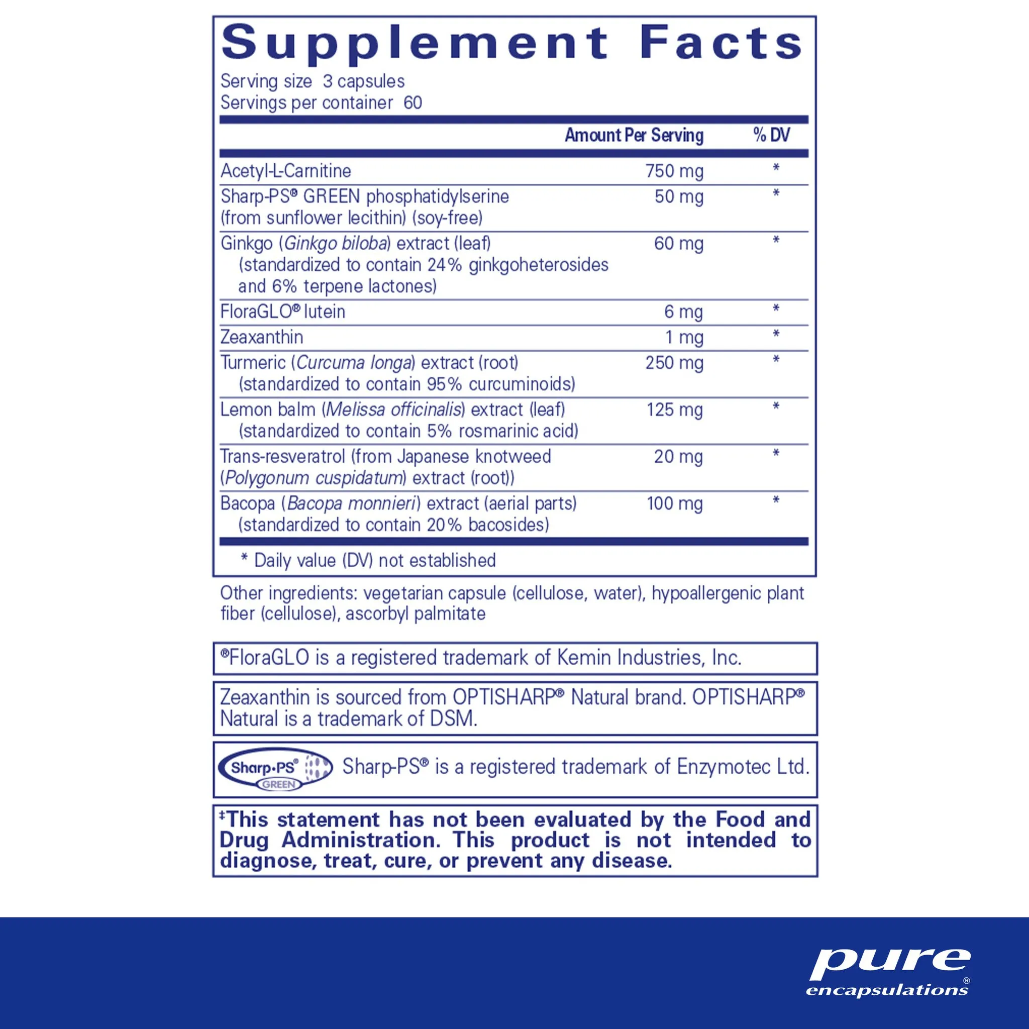 acetyl-l-carnitine, Sharp-PS® GREEN phosphatidylserine (from sunflower lecithin) (soy-free), Ginkgo biloba extract (leaf), FloraGLO® lutein, zeaxanthin, turmeric (Curcuma longa) extract (root), lemon balm (Melissa officinalis) extract (leaf), trans-resveratrol (from Japanese knotweed (Polygonum cuspidatum) extract (root)), bacopa (Bacopa monnieri) extract (aerial parts), vegetarian capsule (cellulose, water), hypoallergenic plant fiber (cellulose), ascorbyl palmitate
