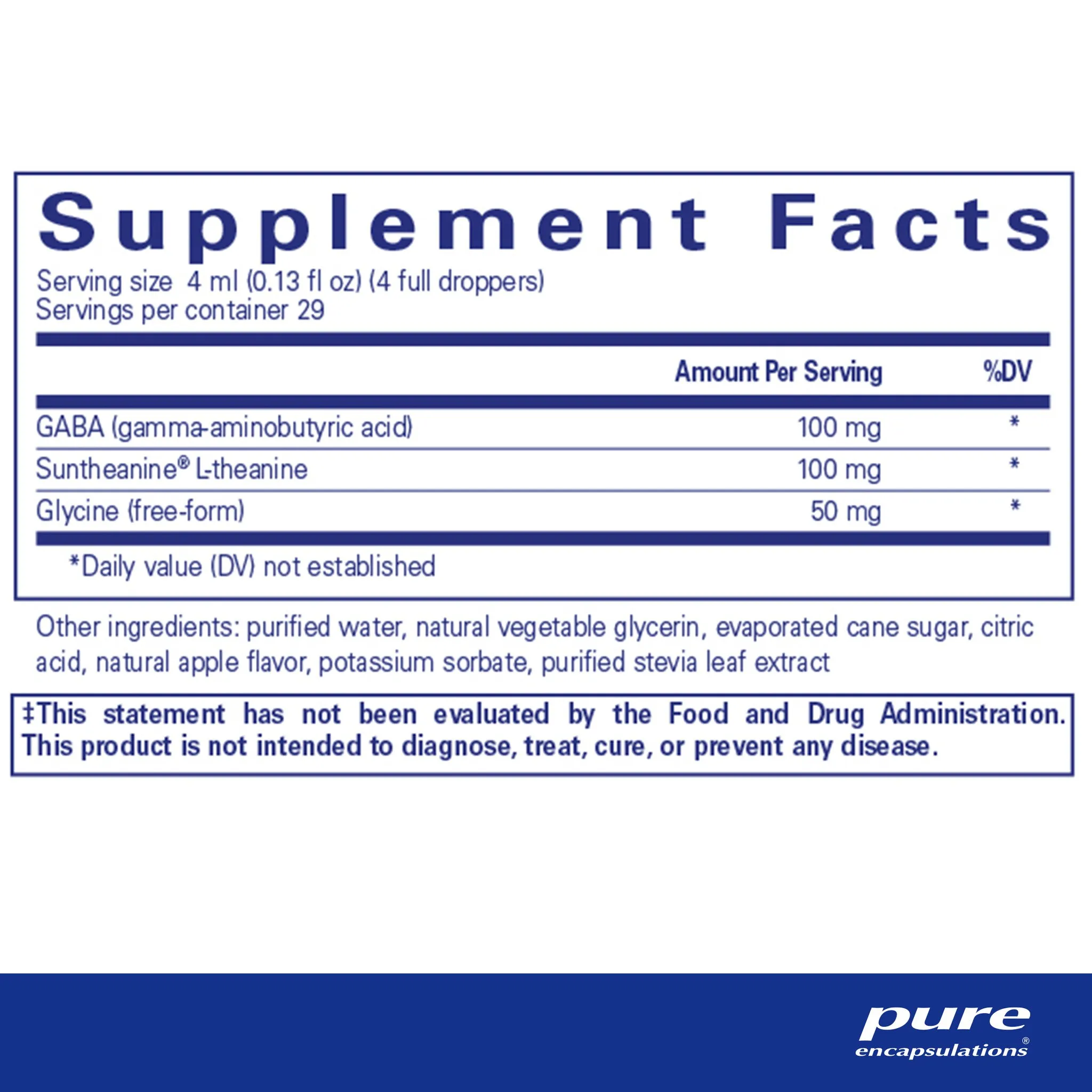 GABA (gamma-aminobutyric acid), Suntheanine® l-theanine, glycine (free-form), purified water, natural vegetable glycerin, evaporated cane sugar, citric acid, natural apple flavor, potassium sorbate, purified stevia extract