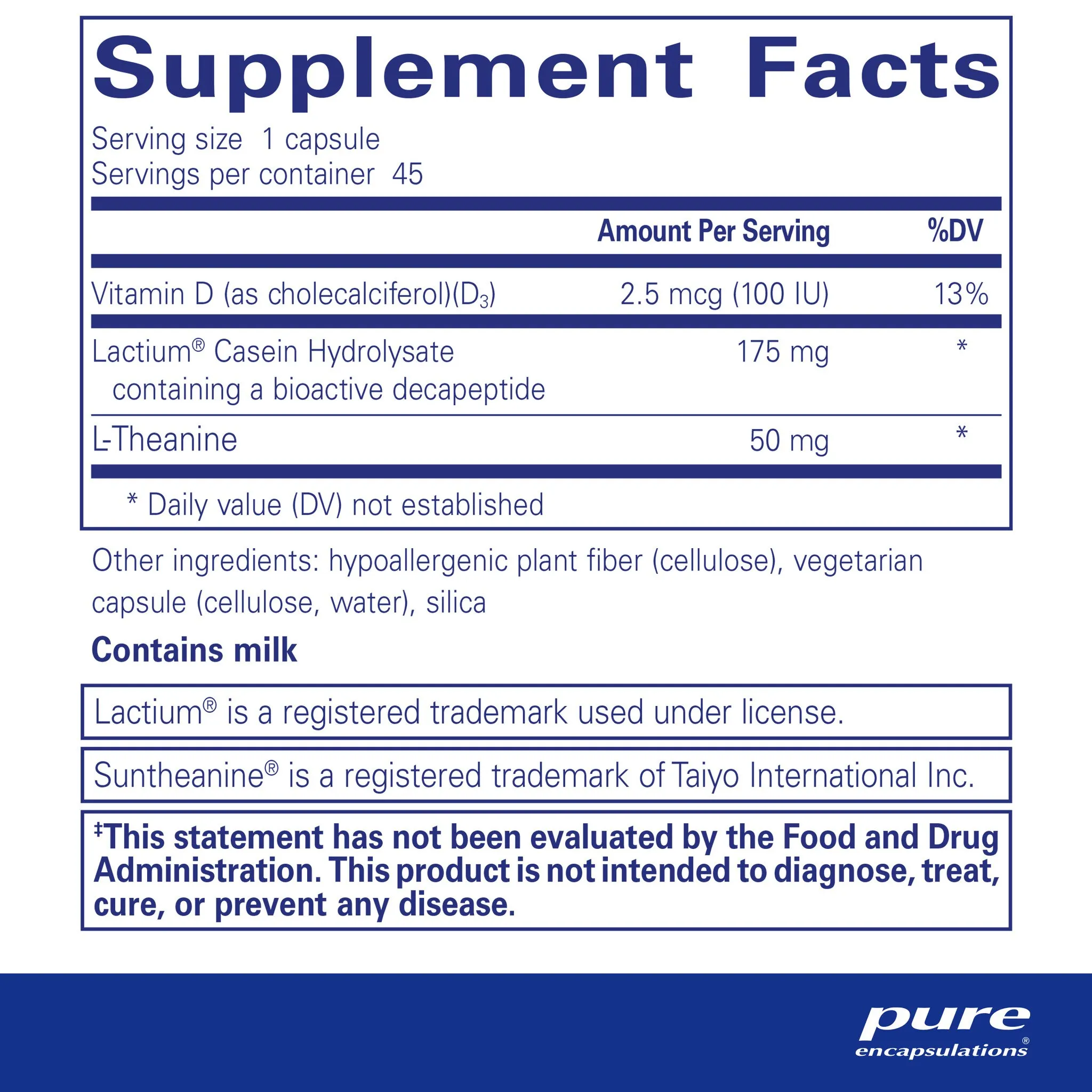 vitamin D (as cholecalciferol)(D3), Lactium® casein decapeptide (milk), l-Theanine, hypoallergenic plant fiber (cellulose), vegetarian capsule (cellulose, water), silica