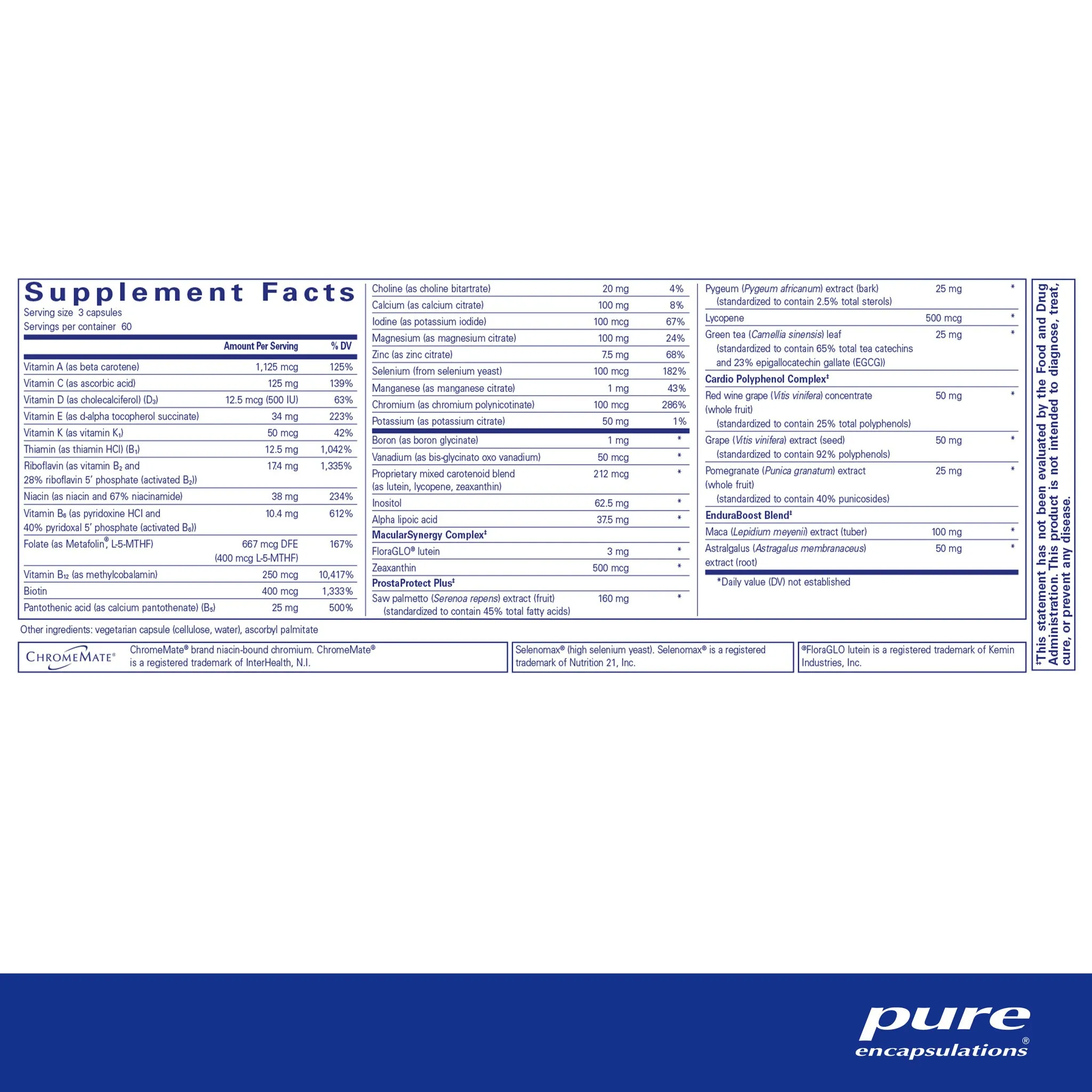 vitamin A (as beta carotene), vitamin C (as ascorbic acid), vitamin D (as cholecalciferol)(D3) (500 IU), vitamin E (as d-alpha tocopherol succinate), vitamin K (as vitamin K1), thiamin (as thiamin HCl) (B1), riboflavin (as vitamin B2 and 61% riboflavin 5' phosphate (activated B2)), niacin (as niacin and 56% niacinamide), vitamin B6 (as pyridoxine HCl and 56% pyridoxal 5' phosphate (activated B6)), folate (as Metafolin®, L-5-MTHF), vitamin B12 (as methylcobalamin), biotin, pantothenic acid (as calcium pantothenate) (B5), calcium (as calcium citrate), iodine (as potassium iodide), magnesium (as magnesium citrate), zinc (as zinc citrate), selenium (from selenium yeast), manganese (as manganese citrate), chromium (as chromium polynicotinate), potassium (as potassium citrate), boron (as boron glycinate), vanadium (as bis-glycinato oxo vanadium), proprietary mixed carotenoid blend (as lutein, lycopene, zeaxanthin), choline (as choline bitartrate), inositol, alpha lipoic acid, FloraGLO® lutein, zeaxanthin, saw palmetto (Serenoa repens) extract (fruit), pygeum (Pygeum africanum) extract (bark), lycopene, green tea (Camellia sinensis) extract (leaf), red wine grape (Vitis vinifera) concentrate (whole fruit), grape (Vitis vinifera) extract (seed), pomegranate (Punica granatum) extract (whole fruit), maca (Lepidium meyenii) extract (tuber), astralgalus (Astragalus membranaceus) extract (root), vegetarian capsule (cellulose, water), ascorbyl palmitate