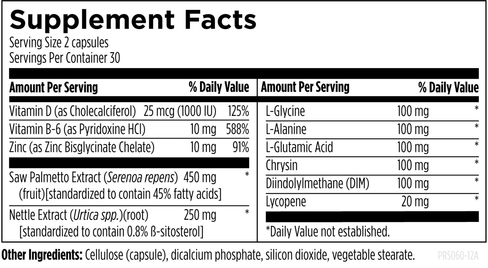 Vitamin D (as Cholecalciferol) (1000 IU), Vitamin B-6 (as Pyridoxine HCl), Zinc (as Zinc Bisglycinate Chelate), Saw Palmetto (Serenoa repens)(fruit) [standardized to contain 45% fatty acids], Nettle (Urtica spp.)(root) [standardized to contain 0.8% β-sitosterol], L-Glycine, L-Alanine, L-Glutamic Acid, Chrysin, Diindolylmethane (DIM), Lycopene, Gelatin (capsule), dicalcium phosphate, silicon dioxide, vegetable stearate.
