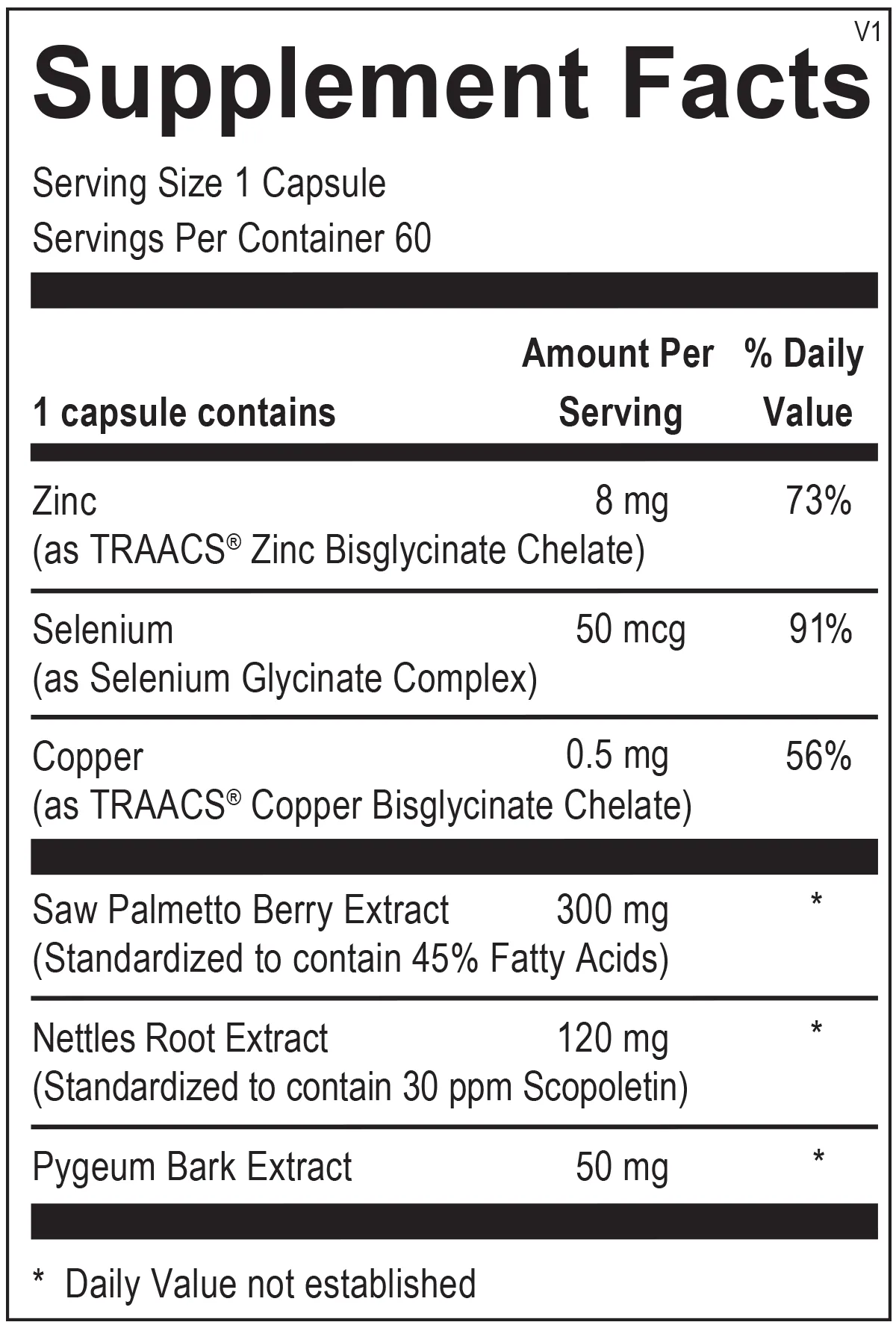 Zinc (as TRAACS® Zinc Bisglycinate Chelate), Selenium (as Selenium Glycinate Complex), Copper (as TRAACS® Copper Bisglycinate Chelate), Saw Palmetto Berry Extract (Standardized to contain 45% Fatty Acids), Nettles Root Extract (Standardized to contain 30 ppm Scopoletin), Pygeum Bark Extract