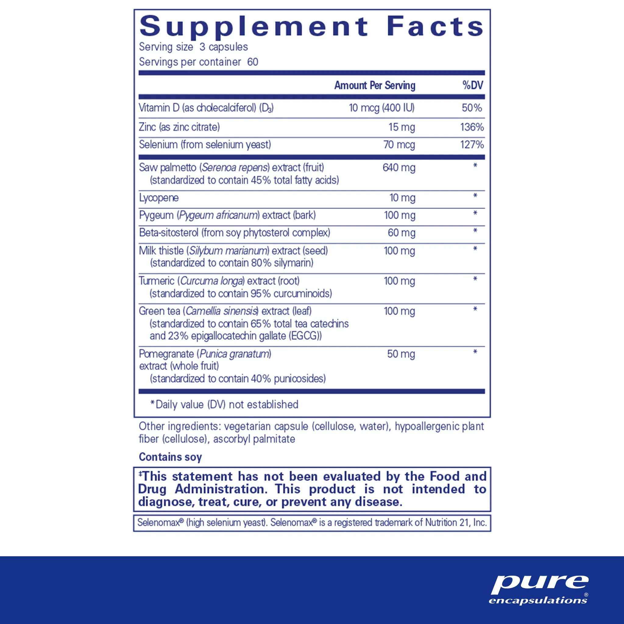 vitamin D (as cholecalciferol)(D3) (400 IU), zinc (as zinc citrate), selenium (from selenium yeast), saw palmetto (Serenoa repens) extract (fruit), lycopene, pygeum (Pygeum africanum) extract (bark), beta-sitosterol (from soy phytosterol complex), milk thistle (Silybum marianum) extract (seed), turmeric (Curcuma longa) extract (root), green tea (Camellia sinensis) extract (leaf), pomegranate (Punica granatum) extract (whole fruit), vegetarian capsule (cellulose, water), hypoallergenic plant fiber (cellulose), ascorbyl palmitate Selenomax® (high selenium yeast). Selenomax® is a registered trademark of Nutrition 21, Inc. Contains soy