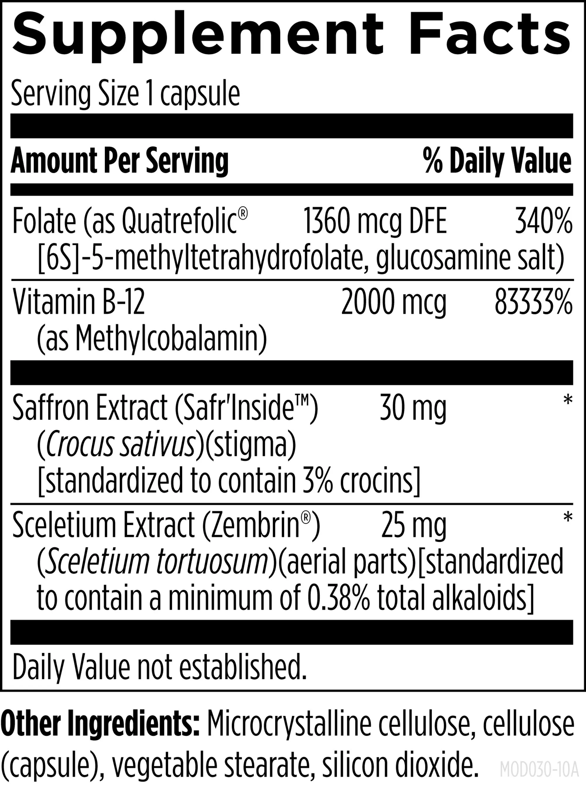 Folate (as Quatrefolic® [6S]-5-methyltetrahydrofolate, glucosamine salt), Vitamin B-12 (as Methylcobalamin), Saffron Extract (Safr'Inside™) (Crocus sativus)(stigma) [standardized to contain 3% crocins], Sceletium Extract (Zembrin®) (Sceletium tortuosum)(aerial parts)[standardized to contain a minimum of 0.38% total alkaloids], Microcrystalline cellulose, cellulose (capsule), vegetable stearate, silicon dioxide.