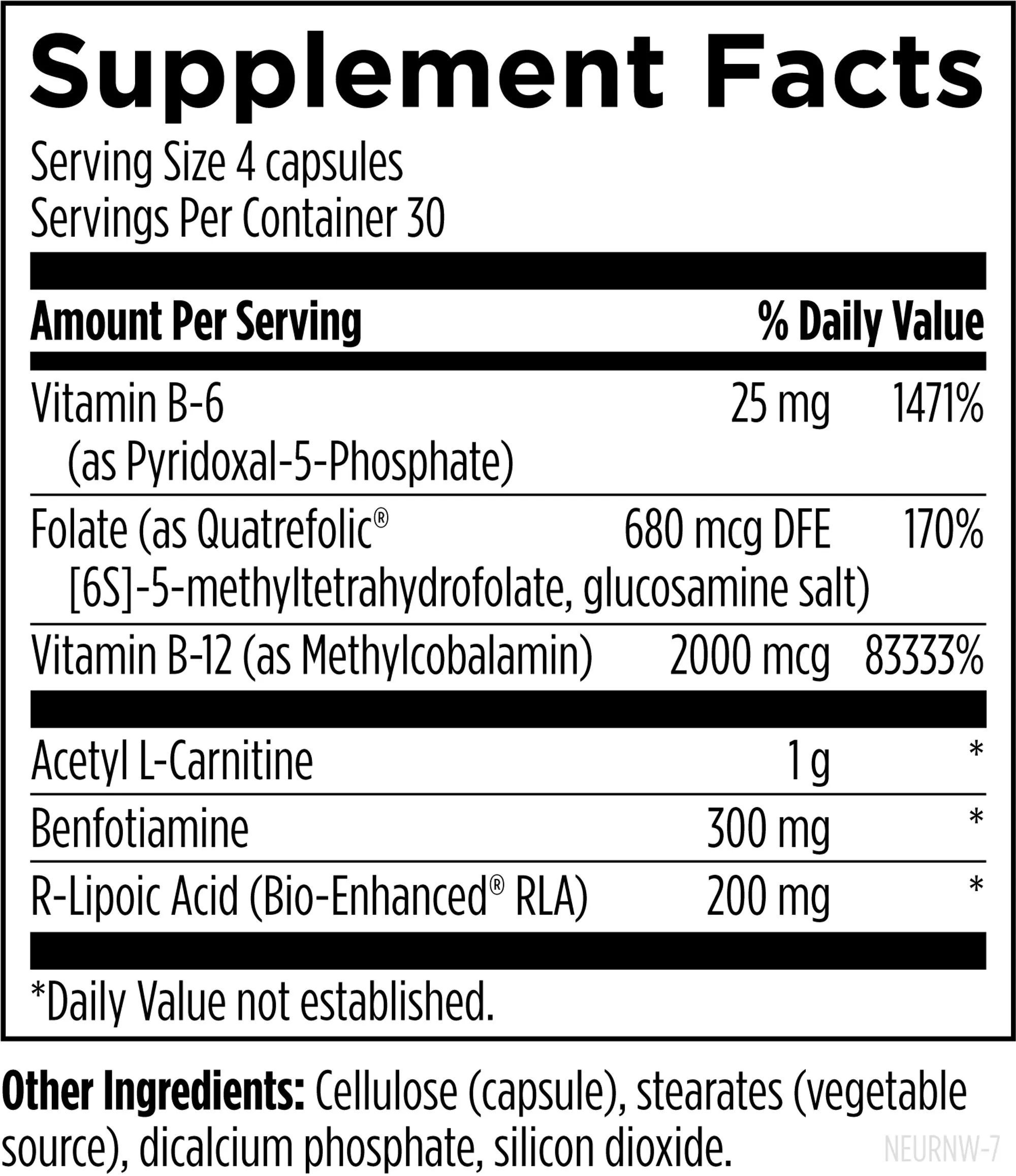 Vitamin B-6 (as Pyridoxal-5-Phosphate), Folate (as Quatrefolic® [6S]-5-methyltetrahydrofolate, glucosamine salt), Vitamin B-12 (as Methylcobalamin [MecobalActive®]), Acetyl L-Carnitine, Benfotiamine, R-Lipoic Acid (Bio-Enhanced® RLA), Cellulose (capsule), stearates (vegetable source), dicalcium phosphate, silicon dioxide.