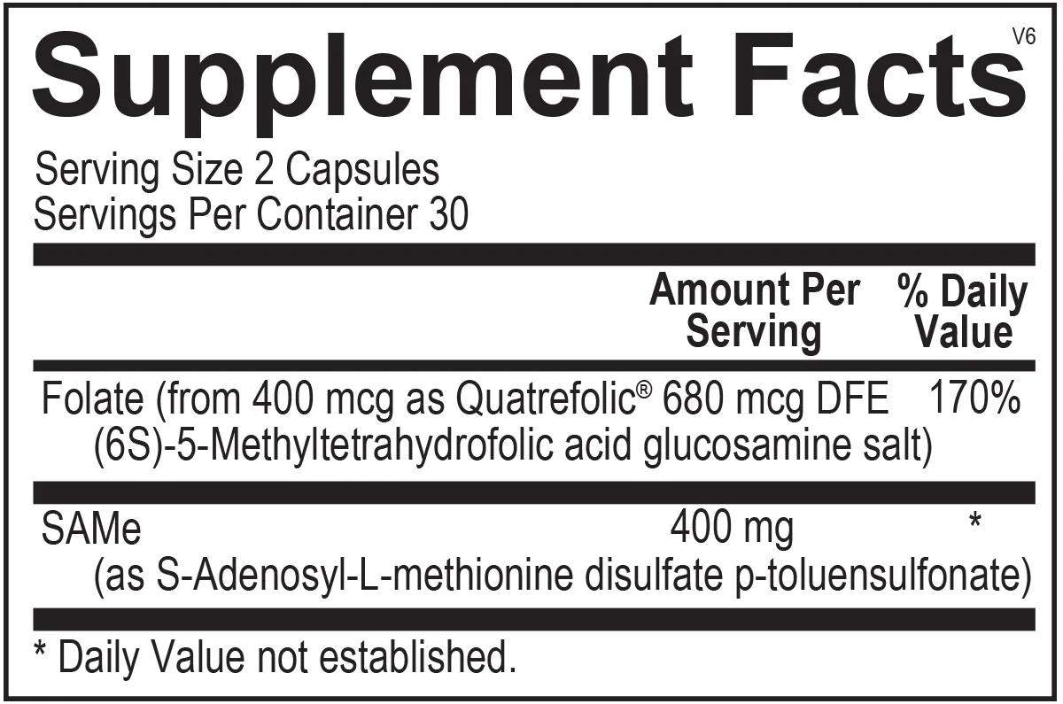 Folate (from 400 mcg as Quatrefolic® (6S)-5-Methyltetrahydrofolic acid glucosamine salt), SAMe (as S-Adenosyl-L-methionine disulfate p-toluensulfonate)