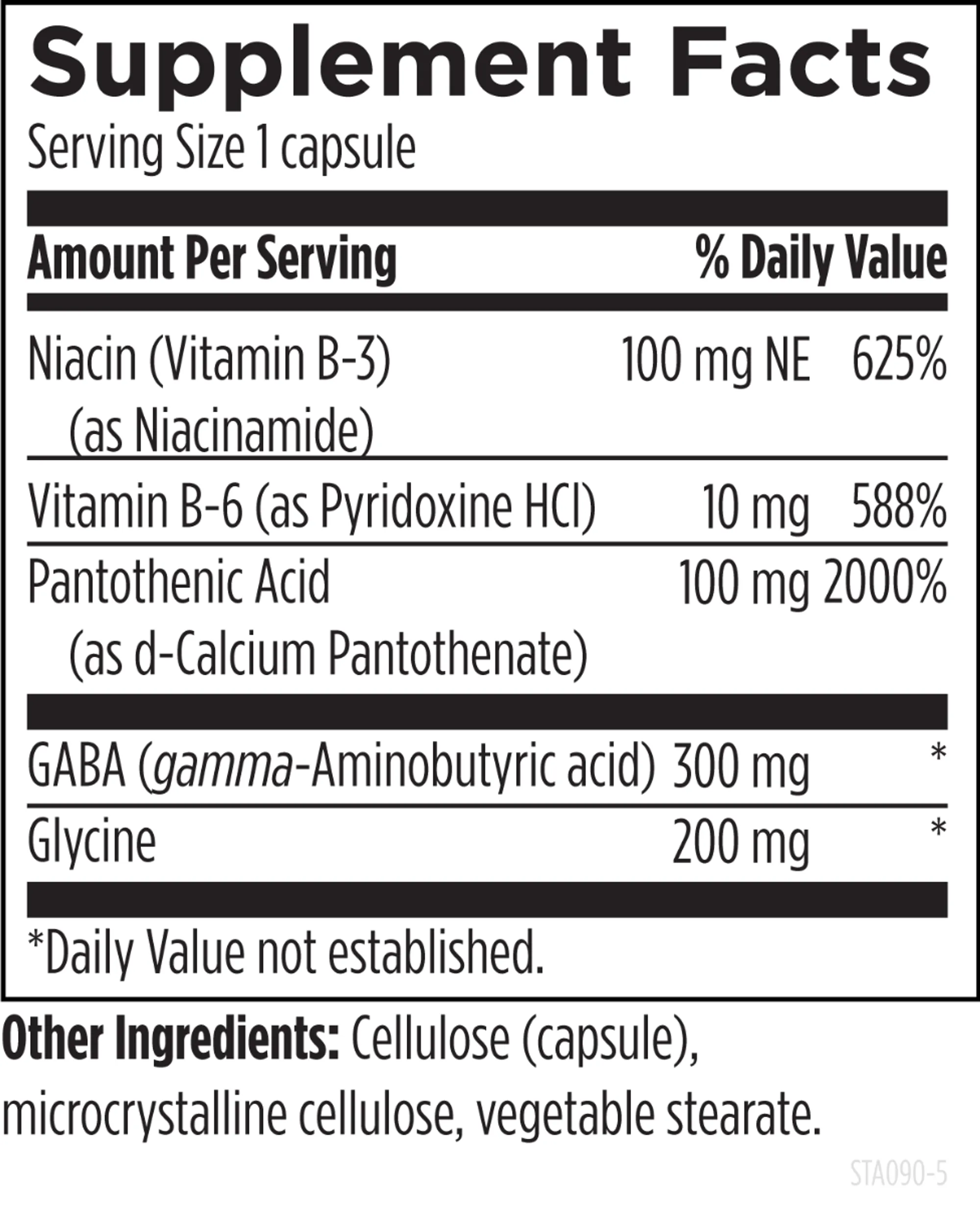 Niacin (Vitamin B-3) (as Niacinamide), Vitamin B-6 (as Pyridoxine HCl), Pantothenic Acid (as d-Calcium Pantothenate), GABA (gamma-Aminobutyric acid), Glycine, Cellulose (capsule), microcrystalline cellulose, vegetable stearate.