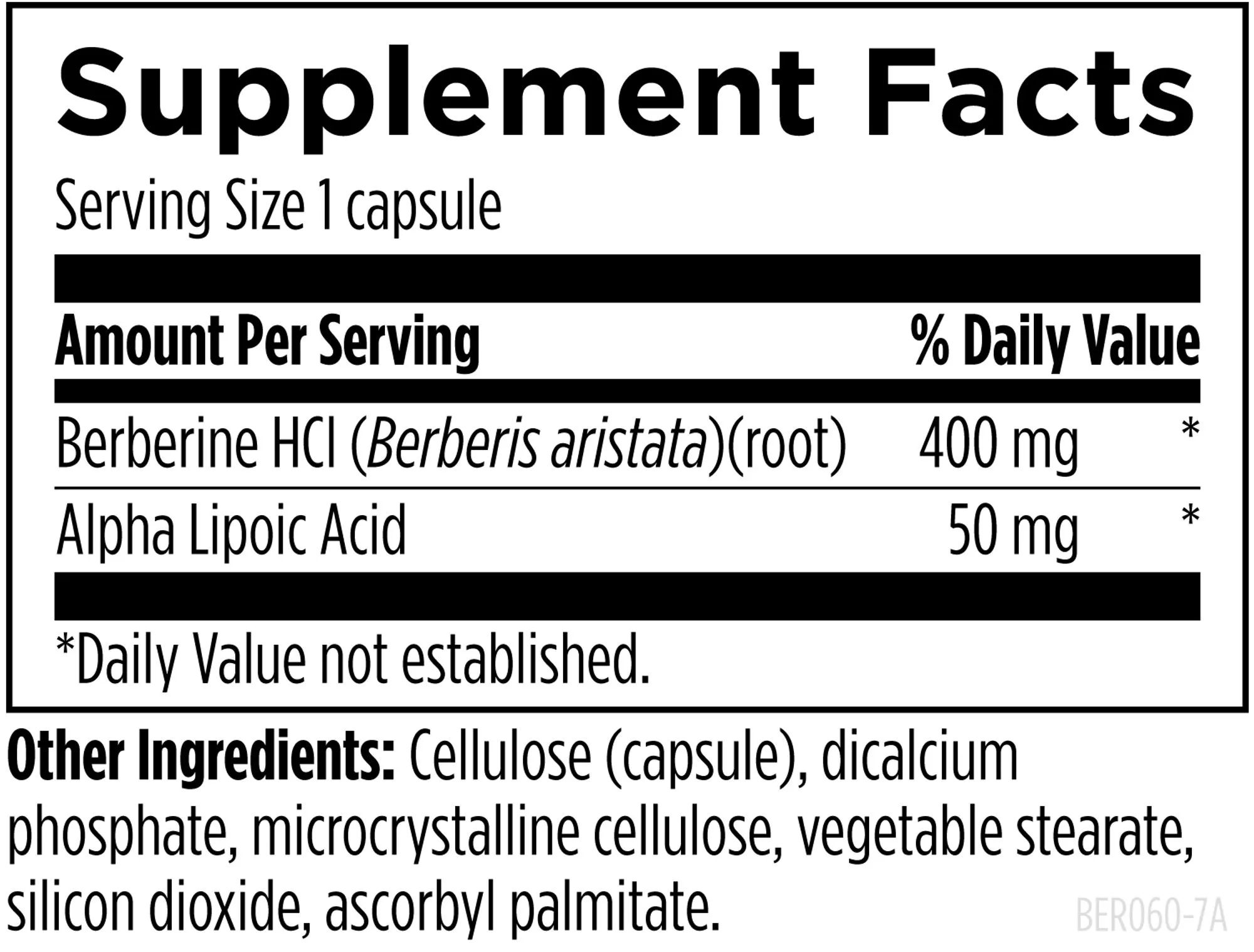 Berberine HCl (Berberis aristata)(root), Alpha Lipoic Acid, Cellulose (capsule), dicalcium phosphate, microcrystalline cellulose, vegetable stearate, silicon dioxide, ascorbyl palmitate.
