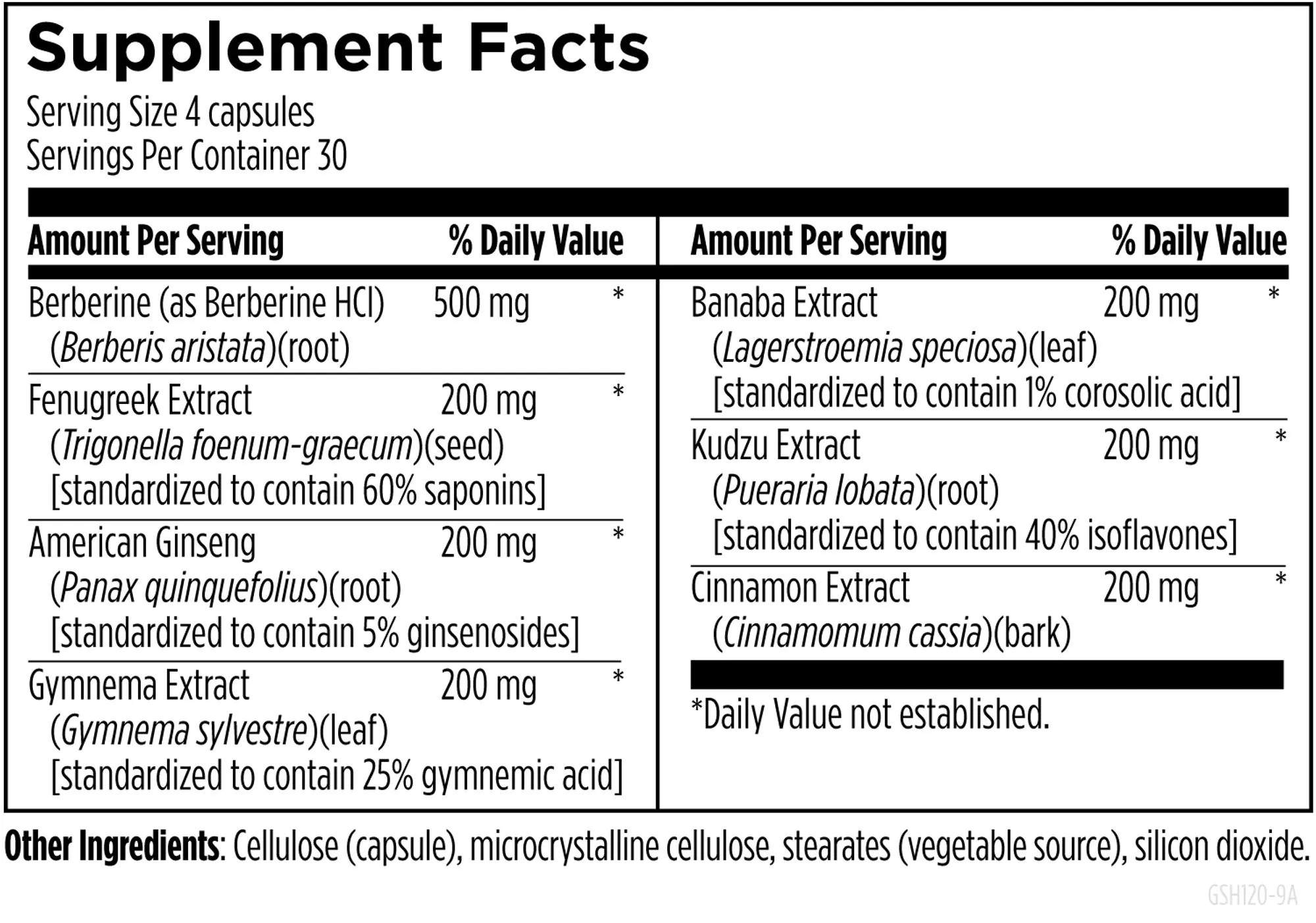 Berberine (as Berberine HCl) (Berberis aristata)(root), Fenugreek Extract (Trigonella foenum-graecum)(seed) [standardized to contain 60% saponins], American Ginseng (Panax quinquefolius)(root) [standardized to contain 5% ginsenosides], Gymnema Extract (Gymnema sylvestre)(leaf) [standardized to contain 25% gymnemic acid], Banaba Extract (Lagerstroemia speciosa)(leaf) [standardized to contain 1% corosolic acid], Kudzu Extract (Pueraria lobata)(root) [standardized to contain 40% isoflavones], Cinnamon Extract (Cinnamomum cassia)(bark), Cellulose (capsule), microcrystalline cellulose, stearates (vegetable source), silicon dioxide.