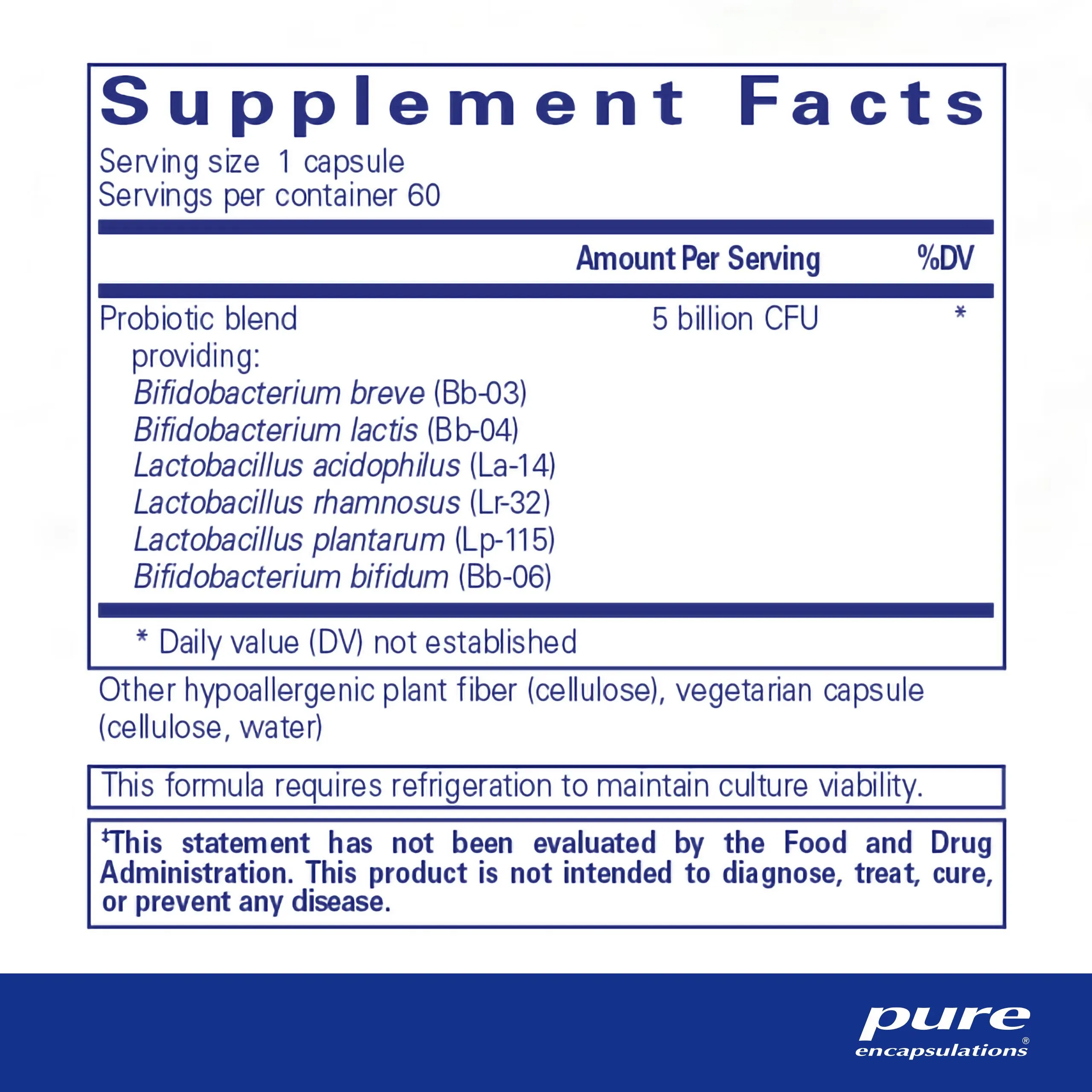 probiotic blend, Lactobacillus acidophilus (La-14), Lactobacillus plantarum (Lp-115), Lactobacillus rhamnosus (Lr-32), Bifidobacterium lactis (Bl-04), Bifidobacterium breve (Bb-03), Bifidobacterium bifidum (Bb-06), rice starch, vegetarian capsule (cellulose, water)