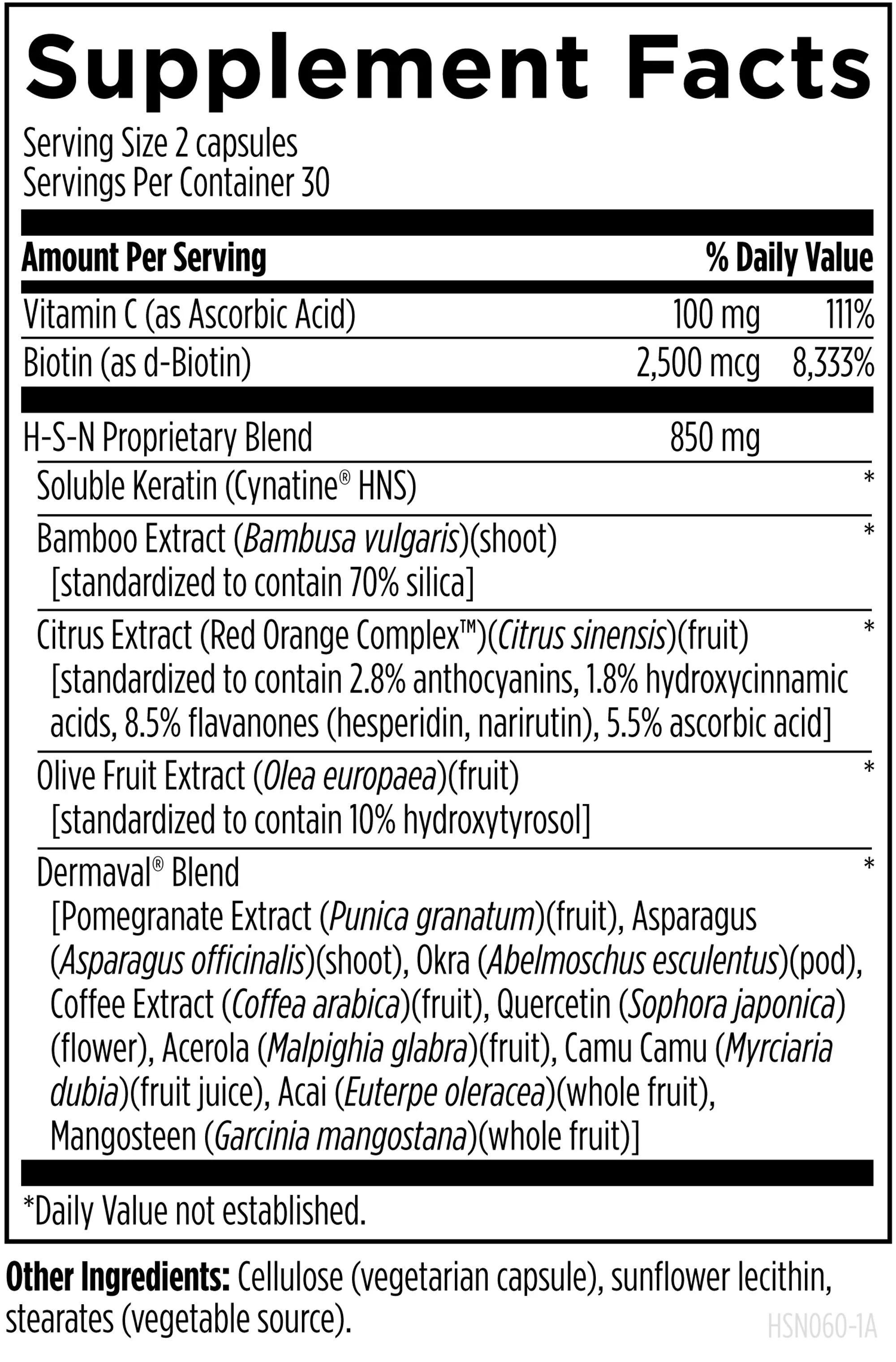 Vitamin C (as Ascorbic Acid), Biotin, H-S-N Proprietary Blend (Soluble Keratin (Cynatine® HNS), Bamboo Extract (Bambusa vulgaris)(shoot) [standardized to contain 70% silica], Citrus Extract (Red Orange Complex™)(Citrus sinensis)(fruit) [standardized to contain 2.8% anthocyanins, 1.8% hydroxycinnamic acids, 8.5% flavanones (hesperidin, narirutin), 5.5% ascorbic acid], Olive Fruit Extract (Olea europaea)(fruit) [standardized to contain 10% hydroxytyrosol], Dermaval® Blend [Pomegranate Extract (Punica granatum)(fruit), Asparagus (Asparagus officinalis)(shoot), Okra (Abelmoschus esculentus)(pod), Coffee Extract (Coffea arabica)(fruit), Quercetin (Sophora japonica)(flower), Acerola (Malpighia glabra)(fruit), Camu Camu (Myrciaria dubia)(fruit juice), Acai (Euterpe oleracea)(whole fruit), Mangosteen (Garcinia mangostana)(whole fruit)]), Cellulose (vegetarian capsule), sunflower lecithin, stearates (vegetable source).